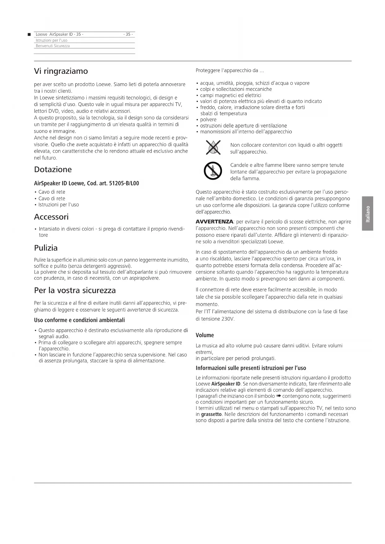 - 35 -Istruzioni per l'usoBenvenuti Sicurezza Vi ringraziamo per aver scelto un prodotto Loewe. Siamo lieti di poterla annoverare tra i nostri clienti. In Loewe sintetizziamo i massimi requisiti tecnologici, di design e di semplicità d'uso. Questo vale in ugual misura per apparecchi TV, lettori DVD, video, audio e relativi accessori. A questo proposito, sia la tecnologia, sia il design sono da considerarsi un tramite per il raggiungimento di un'elevata qualità in termini di suono e immagine. Anche nel design non ci siamo limitati a seguire mode recenti e prov- visorie. Quello che avete acquistato è infatti un apparecchio di qualità elevata, con caratteristiche che lo rendono attuale ed esclusivo anche nel futuro. Dotazione AirSpeaker ID Loewe, Cod. art. 51205-B/L00