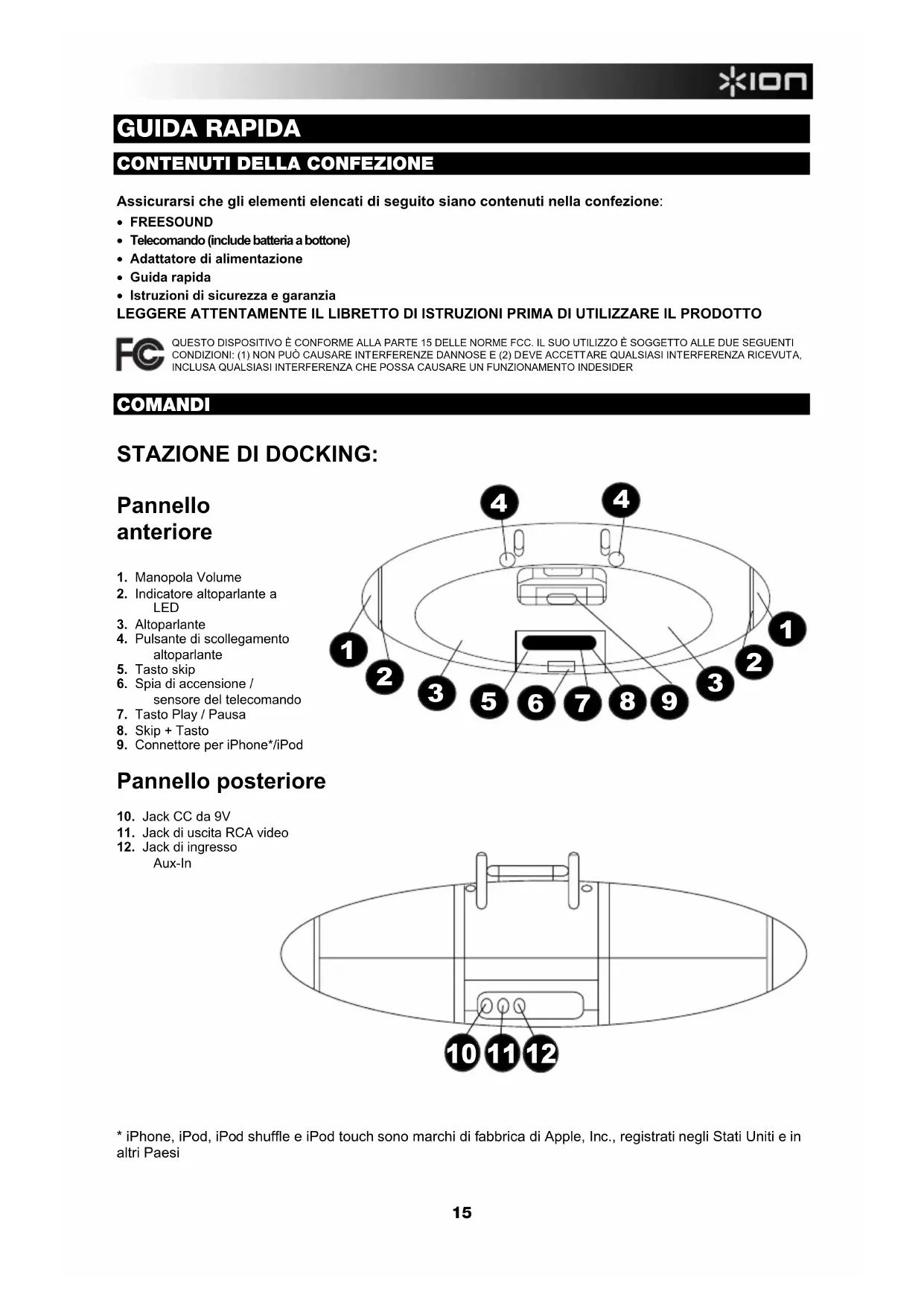 con l'acquisto dell'iPod) e collocarlo nella base del FREESOUND. Quindi collegare l'iPod al dock.