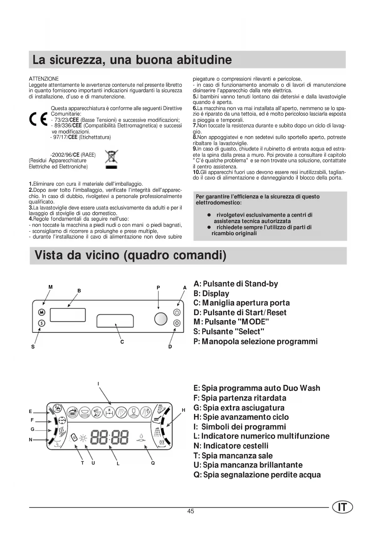 La sicurezza, una buona abitudine ATTENZIONE Leggete attentamente le avvertenze contenute nel presente libretto in quanto forniscono importanti indicazioni riguardanti la sicurezza di installazione, d’uso e di manutenzione. Questa apparecchiatura è conforme alle seguenti Direttive Comunitarie: - 73/23/CEE (Basse Tensioni) e successive modificazioni; - 89/336/CEE (Compatibilità Elettromagnetica) e successi ve modificazioni. - 97/17/CEE (Etichettatura) -2002/96/CE (RAEE) (Residui Apparecchiature Elettriche ed Elettroniche) 1.Eliminare con cura il materiale dell'imballaggio. 2.Dopo aver tolto l'imballaggio, verificate l'integrità dell'apparec- chio. In caso di dubbio, rivolgetevi a personale professionalmente qualificato. 3.La lavastoviglie deve essere usata esclusivamente da adulti e per il lavaggio di stoviglie di uso domestico. 4.Regole fondamentali da seguire nell'uso: - non toccate la macchina a piedi nudi o con mani o piedi bagnati, - sconsigliamo di ricorrere a prolunghe e prese multiple, - durante l'installazione il cavo di alimentazione non deve subire Vista da vicino (quadro comandi) piegature o compressioni rilevanti e pericolose, - in caso di funzionamento anomalo o di lavori di manutenzione disinserire l'apparecchio dalla rete elettrica. 5.I bambini vanno tenuti lontano dai detersivi e dalla lavastoviglie quando é aperta. 6.La macchina non va mai installata all'aperto, nemmeno se lo spa- zio é riparato da una tettoia, ed é molto pericoloso lasciarla esposta a pioggia e temporali. 7.Non toccate la resistenza durante e subito dopo un ciclo di lavag- gio. 8.Non appoggiatevi e non sedetevi sullo sportello aperto, potreste ribaltare la lavastoviglie. 9.In caso di guasto, chiudete il rubinetto di entrata acqua ed estra- ete la spina dalla presa a muro. Poi provate a consultare il capitolo "C'é qualche problema" e se non trovate una soluzione, contattate il centro assistenza. 10.Gli apparecchi fuori uso devono essere resi inutilizzabili, taglian- do il cavo di alimentazione e danneggiando il blocco della porta. A: Pulsante di Stand-by B: Display C: Maniglia apertura porta D: Pulsante di Start/Reset M: Pulsante "MODE" S: Pulsante "Select" P: Manopola selezione programmi E: Spia programma auto Duo Wash F: Spia partenza ritardata G: Spia extra asciugatura H: Spie avanzamento ciclo I: Simboli dei programmi L: Indicatore numerico multifunzione N: Indicatore cestelli T: Spia mancanza sale U: Spia mancanza brillantante Q: Spia segnalazione perdite acqua Per garantire l’efficienza e la sicurezza di questo elettrodomestico: l rivolgetevi esclusivamente a centri di assistenza tecnica autorizzata l richiedete sempre l’utilizzo di parti di ricambio originali