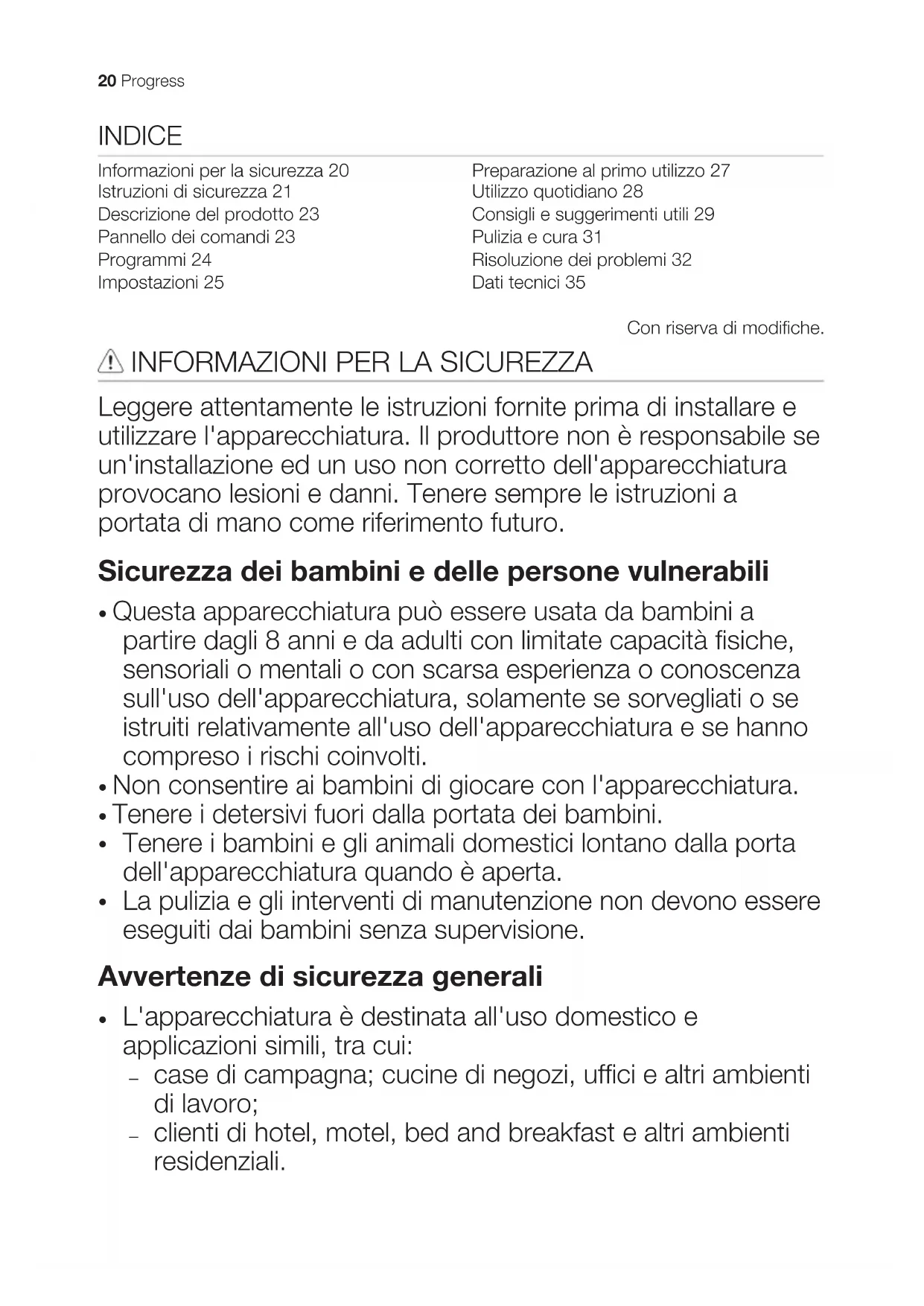 - Rimuovere il blocco porta per evitare che bambini e animali domestici rimangano chiusi all'interno dell'apparecchiatura. 22 ProgressDESCRIZIONE DEL PRODOTTO
