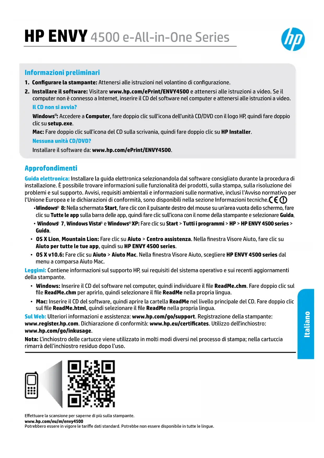 : Accedere a Computer, fare doppio clic sull’icona dell’unità CD/DVD con il logo HP, quindi fare doppio clic su setup.exe. Mac: Fare doppio clic sull’icona del CD sulla scrivania, quindi fare doppio clic su HP Installer. Nessuna unità CD/DVD? Installare il software da: www.hp.com/ePrint/ENVY4500. Approfondimenti Guida elettronica: Installare la guida elettronica selezionandola dal software consigliato durante la procedura di installazione. È possibile trovare informazioni sulle funzionalità dei prodotti, sulla stampa, sulla risoluzione dei problemi e sul supporto. Avvisi, requisiti ambientali e informazioni sulle normative, inclusi l’Avviso normativo per l’Unione Europea e le dichiarazioni di conformità, sono disponibili nella sezione Informazioni tecniche.