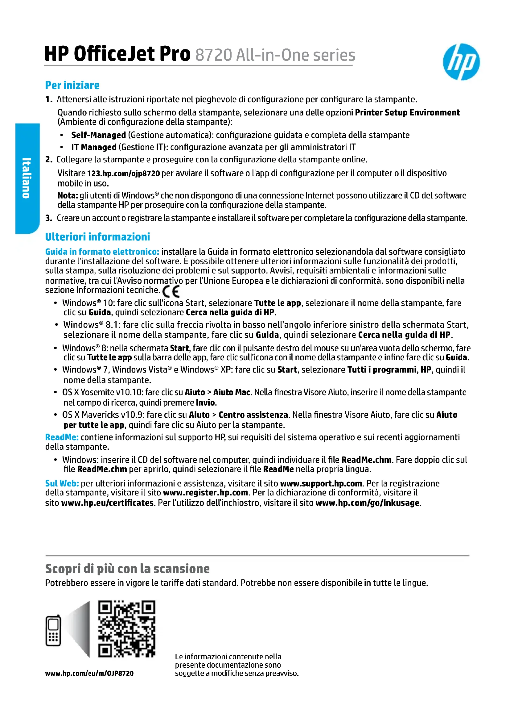 - Windows: inserire il CD del software nel computer, quindi individuare il le ReadMe.chm. Fare doppio clic sul le ReadMe.chm per aprirlo, quindi selezionare il le ReadMe nella propria lingua. Sul Web: per ulteriori informazioni e assistenza, visitare il sito www.support.hp.com. Per la registrazione della stampante, visitare il sito www.register.hp.com. Per la dichiarazione di conformità, visitare il sito www.hp.eu/certicates. Per l'utilizzo dell'inchiostro, visitare il sito www.hp.com/go/inkusage. Le informazioni contenute nella presente documentazione sono soggette a modiche senza preavviso. Scopri di più con la scansione Potrebbero essere in vigore le tarie dati standard. Potrebbe non essere disponibile in tutte le lingue. HP OiceJet Pro 8720 All-in-One series Italiano27 Wireless Seguendo le istruzioni sul pannello di controllo della stampante e installando il software della stampante HP, la connessione della stampante alla rete wireless dovrebbe risultare attiva. Nota: per cambiare il tipo di collegamento utilizzato dalla stampante (ad esempio da USB a wireless o viceversa), utilizzare gli strumenti in dotazione con il software della stampante HP. Suggerimento: grazie alla funzione Wi-Fi Direct, è possibile stampare in modalità wireless da un computer, uno smartphone, un tablet o altri dispositivi con funzionalità wireless senza connettersi a una rete wireless esistente. Per ulteriori informazioni, consultare "Change the connection type" (Cambiare il tipo di connessione) e "Use Wi-Fi Direct" (Utilizzare Wi-Fi Direct) nella Guida in formato elettronico (vedere "Ulteriori informazioni" a pagina 26). Risoluzione dei problemi di connessione wireless