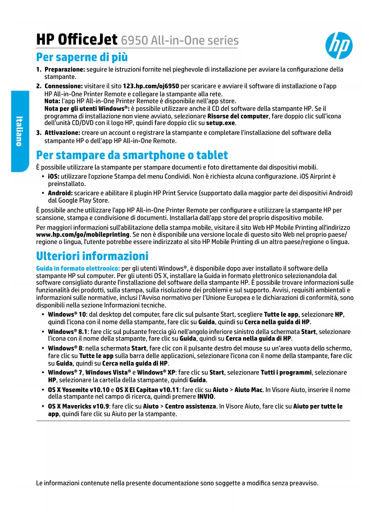 SPECIFICAMENTE NELLA PRESENTE GARANZIA HP, IN NESSUN CASO HP O I RELATIVI FORNITORI SARANNO RESPONSABILI DI DANNI DIRETTI, INDIRETTI, SPECIALI, ACCIDENTALI O CONSEGUENTI, O ALTRI DANNI DERIVANTI DALL'INADEMPIMENTO DEL CONTRATTO, ILLECITO CIVILE O ALTRO. D. Disposizioni locali 1. Questa garanzia HP conferisce al cliente diritti legali specifici. Il cliente può anche godere di altri diritti legali che variano da stato a stato negli Stati Uniti, da provincia a provincia in Canada, e da paese/regione a paese/regione nel resto del mondo. 2. Laddove la presente garanzia HP risulti non conforme alle leggi locali, essa verrà modificata secondo tali leggi. Per alcune normative locali, alcune clausole, esclusioni e limitazioni della presente garanzia HP possono non essere applicabili. Garanzia del Produttore La Garanzia limitata HP è una garanzia commerciale fornita volontariamente da HP. Di seguito sono indicati nome e indirizzo della società HP responsabile della fornitura dei servizi coperti dalla Garanzia limitata HP nel vostro Paese: Italia: HP Italy S.r.l., Via G. Di Vittorio 9, 20063 Cernusco S/Naviglio I vantaggi della Garanzia limitata HP vengono concessi ai consumatori in aggiunta ai diritti derivanti dalla garanzia di due anni fornita dal venditore in caso di non conformità dei beni rispetto al contratto di vendita. Tuttavia, diversi fattori possono avere un impatto sulla possibilita’ di beneficiare di tali diritti. I diritti spettanti ai consumatori in forza della garanzia legale non sono in alcun modo limitati, né modificati dalla Garanzia limitata HP. Per ulteriori informazioni, si prega di consultare il seguente link: Garanzia legale per i clienti, oppure visitare il sito Web dei Centri europei per i consumatori. I consumatori hanno il diritto di scegliere se richiedere un servizio usufruendo della Garanzia limitata HP oppure rivolgendosi al venditore per far valere la garanzia legale di due anni. Per ulteriori informazioni consultare il seguente collegamento: Garanzia legale per il consumatore (www.hp.com/go/eu-legal) oppure visitare il sito Web dei centri europei dei consumatori (http://ec.europa.eu/consumers/solving_consumer_disputes/non-judicial_redress/ecc-net/). Prodotto HP Durata della garanzia limitata Stampante Garanzia hardware di 1 anno. Cartucce di stampa o di inchiostro Fino ad esaurimento dell'inchiostro HP o fino al raggiungimento della data di "scadenza della garanzia" stampata sulla cartuccia, a seconda di quale evento si verifichi per primo. La presente garanzia non copre i prodotti con inchiostro HP che siano stati ricaricati, ricostruiti, ricondizionati, utilizzati in modo improprio o manomessi. Testine di stampa (si applica solo ai prodotti con testine 1 anno di stampa sostituibili dal cliente) Accessori 1 anno salvo diversamente definitoHP OiceJet 6950 All-in-One series As informações aqui contidas estão sujeitas a alterações sem prévio aviso. Introdução