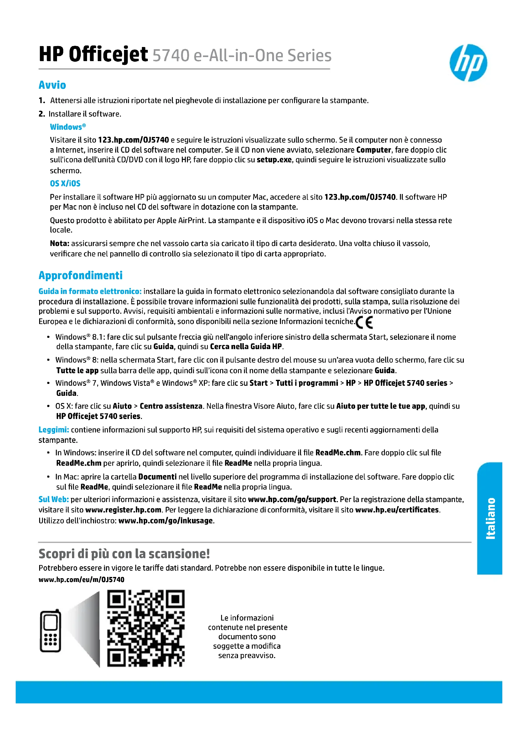 LEGGE, NON ESCLUDONO, LIMITANO O MODIFICANO, BENSÌ INTEGRANO, I DIRITTI LEGALI APPLICABILI ALLA VENDITA DEI PRODOTTI HP AI CLIENTI DI TALI PAESI. Garanzia del Produttore In allegato il cliente troverà i nomi e indirizzi delle Società del Gruppo HP che prestano i servizi in Garanzia (garanzia di buon funzionamento e garanzia convenzionale) in Italia. Italia: Hewlett-Packard Italiana S.r.L., Via G. Di Vittorio 9, 20063 Cernusco sul Naviglio Oltre alla Garanzia del Produttore, ed in modo indipendente dalla stessa, il Consumatore potra’ far valere i propri diritti di legge nei confronti del venditore tra cui il diritto di chiedere, nei primi 24 mesi dalla data di acquisto del prodotto, la riparazione gratuita o la sostituzione del prodotto non conforme al contratto ai sensi dell’art. 130 del Codice del Consumo (Dlgs. 206/2005) laddove ne ricorrano le condizioni. Prodotto HP Durata della garanzia limitata Supporti del software 90 giorni Stampante 1 anno Cartucce di stampa o di inchiostro Fino ad esaurimento dell'inchiostro HP o fino al raggiungimento della data di "scadenza della garanzia" stampata sulla cartuccia, a seconda di quale evento si verifichi per primo. La presente garanzia non copre i prodotti con inchiostro HP che siano stati ricaricati, ricostruiti, ricondizionati, utilizzati in modo improprio o manomessi. Testine di stampa (si applica solo ai prodotti con testine di stampa sostituibili dal cliente) 1 anno Accessori 1 anno salvo diversamente definito ItalianoLa información contenida en este documento puede sufrir modicaciones sin previo aviso. ¡Escanee para descubrir más! Es posible que se apliquen tarifas estándares para datos. Es posible que no esté disponible en todos los idiomas. Más información Ayuda electrónica: Instale la Ayuda electrónica seleccionándola en el software recomendado durante la instalación del software. Obtenga información sobre las funciones del producto, la impresión, la resolución de problemas y el soporte. En la sección Información técnica, encontrará información sobre avisos, medio ambiente y normativa, incluidos los avisos reglamentarios de la Unión Europea y las declaraciones de cumplimiento.
