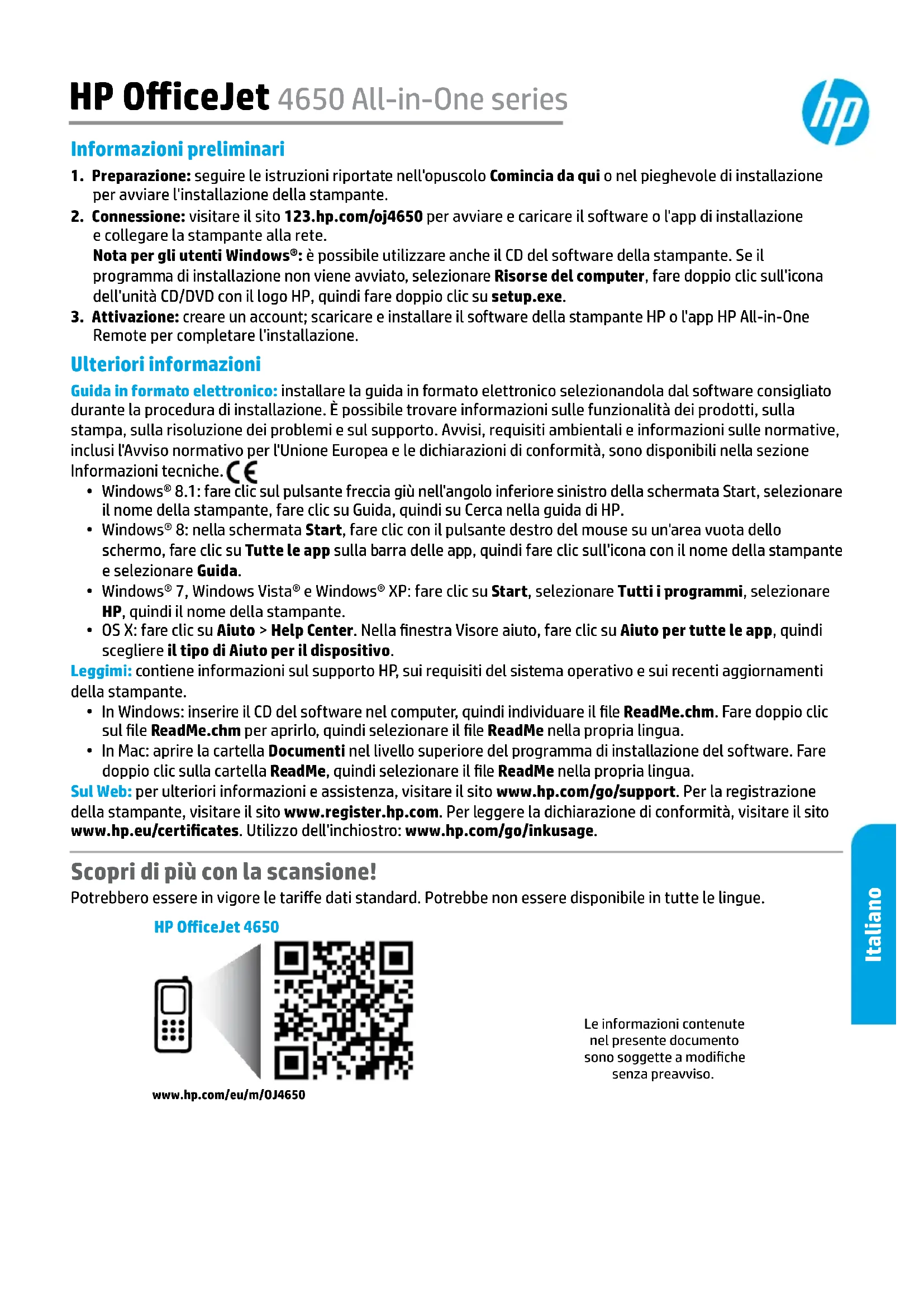 Remote per completare l'installazione. HP OiceJet 4650 All-in-One series Italiano Le informazioni contenute nel presente documento sono soggette a modiche senza preavviso.www.hp.com/eu/m/OJ4650HP OiceJet 465032 Informazioni sulla sicurezza Per utilizzare questa stampante, seguire sempre le precauzioni di sicurezza fondamentali al ne di ridurre il rischio di lesioni alle persone derivanti da incendi o scosse elettriche.