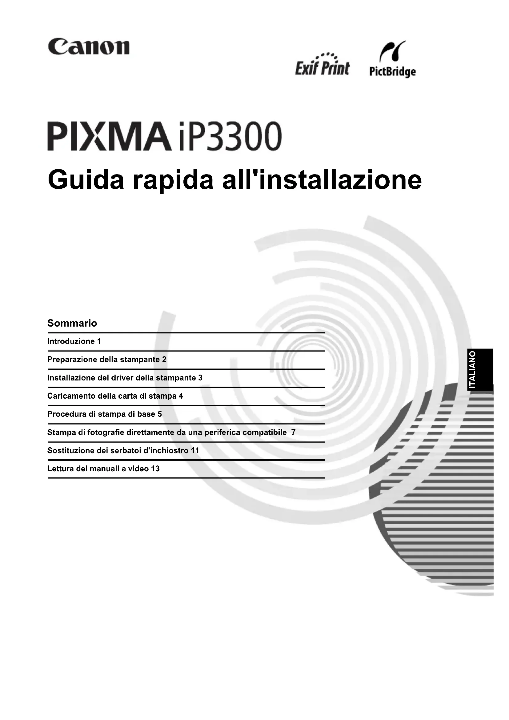 Avvertenza z Non tentare mai di disinserire o inserire il cavo di alimentazione nella presa di corrente con le mani bagnate. z Non danneggiare, modificare, tirare, piegare eccessivamente o attorcigliare il cavo di alimentazione. Non appoggiare oggetti pesanti sopra di esso. z Non utilizzare tensioni elettriche diverse da quelle del paese di acquisto. L'uso di tensioni o frequenze di alimentazione non corrette può causare incendi o scosse elettriche.z Inserire a fondo la spina nella presa elettrica. Attenzione z Per ragioni di sicurezza, conservare i serbatoi d'inchiostro fuori dalla portata dei bambini. z Non scuotere né lasciare cadere i serbatoi. L'inchiostro potrebbe fuoriuscire e macchiare gli abiti e le mani. Leggere inoltre la sezione Precauzioni per la sicurezza nel Manuale dell'utente a video. Rispettare le avvertenze per evitare lesioni personali o danni alla stampante. Codice modello: K10280 (iP3300)1Introduzione ITALIANO Introduzione Grazie per avere acquistato una stampante Canon Inkjet. La presente Guida rapida all'installazione utilizza i seguenti simboli per segnalare informazioni importanti. Seguire sempre le istruzioni indicate da questi simboli. Avvertenza La mancata osservanza di queste istruzioni può causare la morte o gravi lesioni personali dovute a un uso non corretto dell'apparecchiatura. Il rispetto delle istruzioni garantisce un funzionamento sicuro. Attenzione La mancata osservanza di queste istruzioni può causare lesioni personali o danni all'apparecchiatura dovute a un uso non corretto della stessa. Il rispetto delle istruzioni garantisce un funzionamento sicuro. Importante Istruzioni da osservare per un funzionamento sicuro. Informazioni sui marchi z "Windows" e "Internet Explorer" sono marchi di Microsoft Corporation, registrati negli Stati Uniti e in altri paesi. z "Macintosh" e "Mac" sono marchi di Apple Computer, Inc., registrati negli U.S.A. e in altri paesi. z "Adobe" e "Adobe RGB (1998)" sono marchi registrati o marchi di Adobe Systems Incorporated negli Stati Uniti e/o in altri paesi. Copyright ©2006 CANON INC. Tutti i diritti riservati. Le informazioni contenute nella presente pubblicazione non possono essere trasmesse o copiate in alcun modo senza esplicito consenso scritto.2 Preparazione della stampante ITALIANO Preparazione della stampante Leggere la procedura rapida d'installazione (Foglio di installazione) prima dell'installazione della stampante e tenerla a portata di mano. 1 Accendere la stampante. 2 Installare la testina di stampa. 3 Installare i serbatoi d'inchiostro. Attenzione Verificare di aver tolto i nastri prima di accendere la stampante. Nota z La posizione del nastro potrebbe essere diversa da quella mostrata. z Inserire completamente il cavo di alimentazione perche l'inserimento potrebbe essere difficoltoso. Attenzione Non toccare altri componenti interni diversi dalla leva di blocco della testina di stampa. Importante Se il coperchio superiore viene lasciato aperto per più di 10 minuti, il supporto della testina di stampa si sposta verso destra. In tal caso, chiudere e riaprire il coperchio superiore. Nota z All'interno dell'involucro della testina di stampa o all'interno del cappuccio protettivo potrebbe esserci un po' di inchiostro trasparente o celeste, che comunque non pregiudica la qualità di stampa. Fare attenzione a non sporcarsi quando si maneggiano le testine di stampa.z Una volta tolto, non riapplicare il cappuccio protettivo. Importante z Accertarsi che tutti i serbatoi d'inchiostro siano installati nella posizione corretta indicata sull'etichetta. La stampante non può essere utilizzata se non sono installati tutti i serbatoi d'inchiostro. z Dopo l'installazione dei serbatoi d'inchiostro, la spia [POWER] (ACCENSIONE) lampeggerà di luce verde. Prima di continuare, attendere circa 2 minuti, finché la spia [POWER] (ACCENSIONE) non avrà smesso di lampeggiare ed emetterà luce verde continua e la stampante avrà cessato di emettere i caratteristici rumori di funzionamento iniziali. Nota z Verificare di aver tolto la pellicola trasparente dal serbatoio d'inchiostro eseguendo le operazioni nell'esatto ordine indicato al punto 3 della procedura rapida d'installazione (Foglio di installazione). z Non stringere i lati del serbatoio perché ciò potrebbe causare la fuoriuscita dell'inchiostro e macchiare abiti e mani.z Una volta tolto, non riapplicare il cappuccio protettivo. z Se un serbatoio d'inchiostro non è installato correttamente, l'indicatore [ALARM] (ALLARME) sulla stampante lampeggia di luce arancione. Aprire il coperchio superiore e verificare che la posizione di tutti i serbatoi d'inchiostro corrisponda alle indicazioni sull'etichetta.3Installazione del driver della stampante ITALIANO Installazione del driver della stampante Informazioni comuni a Windows