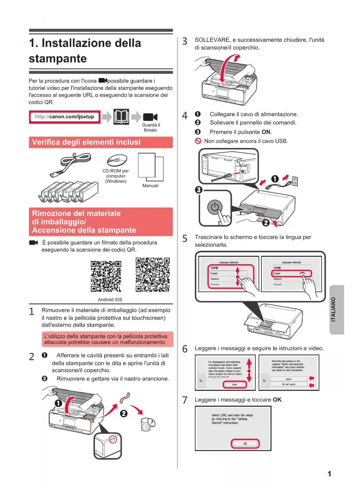 stampante Per la procedura con l'icona , è possibile guardare i tutorial video per l'installazione della stampante eseguendo l'accesso al seguente URL o eseguendo la scansione dei codici QR. Guarda il lmato Verica degli elementi inclusi CD-ROM per computer (Windows)Manuali Rimozione del materiale di imballaggio/ Accensione della stampante È possibile guardare un lmato della procedura eseguendo la scansione dei codici QR. Android iOS