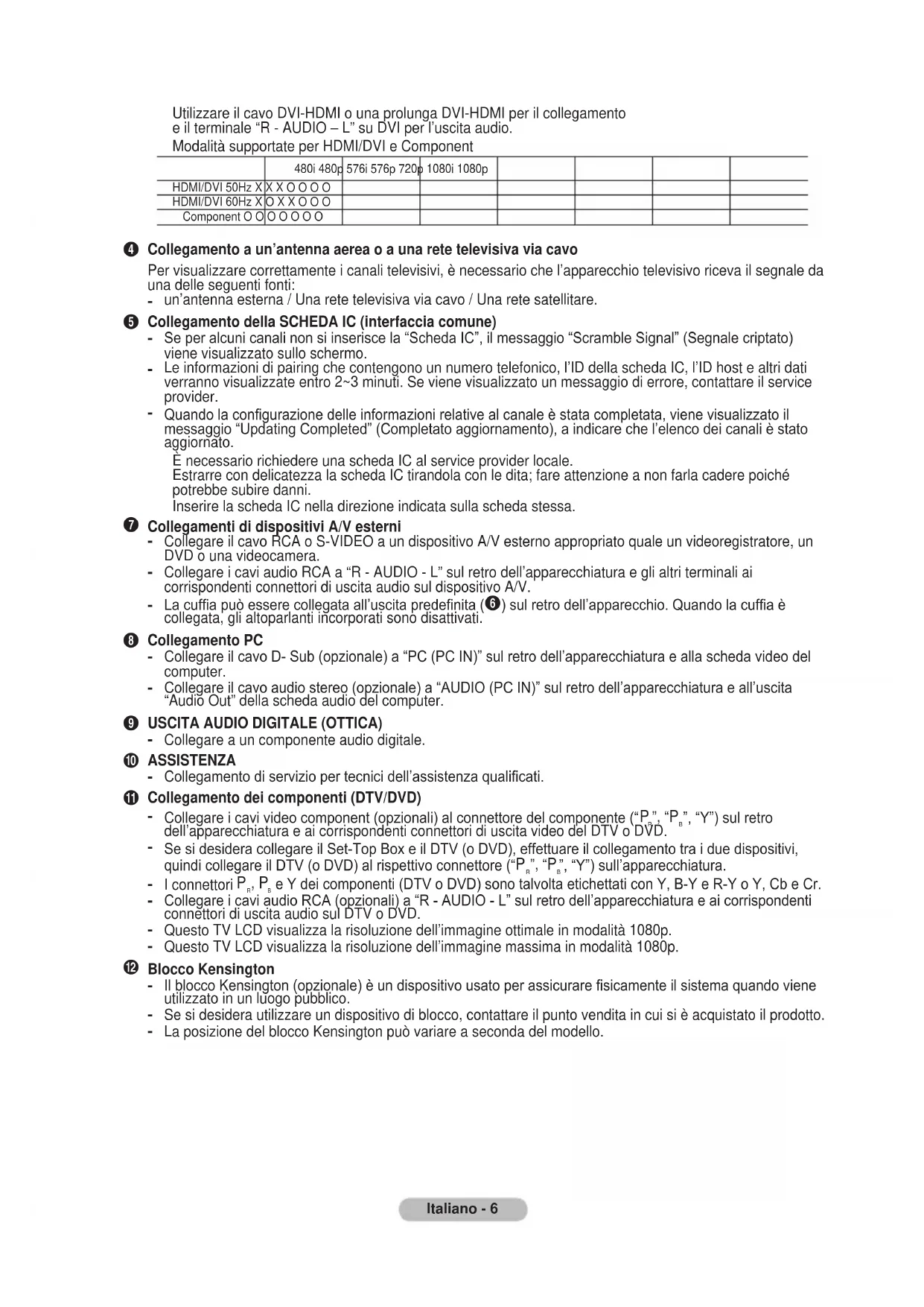 BN68-01186A-Ita-0312.indd 5 2007-03-13 7:09:36Italiano - 6 Utilizzare il cavo DVI-HDMI o una prolunga DVI-HDMI per il collegamento e il terminale “R - AUDIO – L” su DVI per l’uscita audio. Modalità supportate per HDMI/DVI e Component
