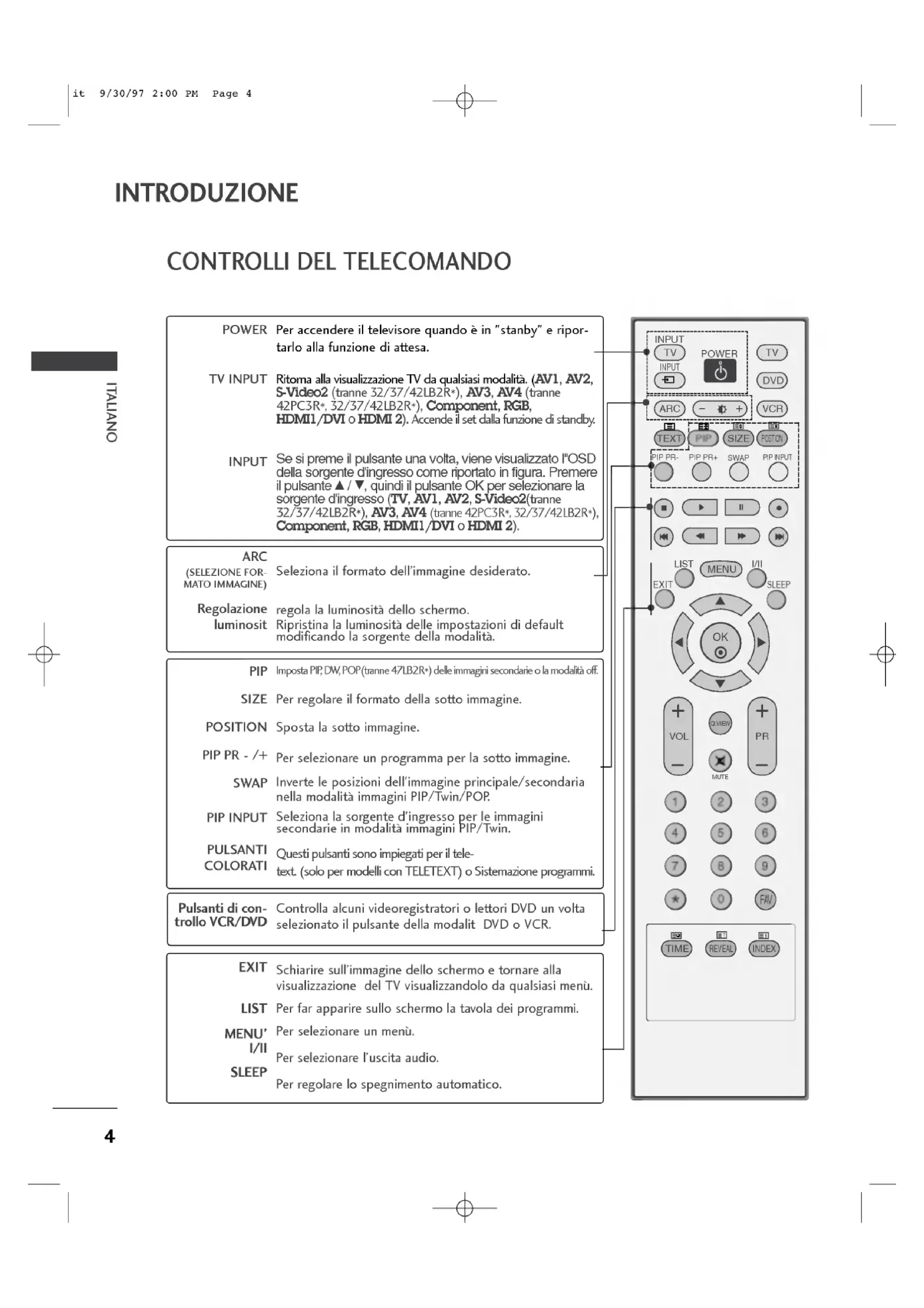 ITALIANO INTRODUZIONE CONTROLLI Sitrattadiuna rappresentazione semplificata del pannello frontale.In questa rappresentazione cipossonoessereeventualidifferenze rispetto allaTVfornita. Controlli del pannello frontale Pulsanti PROGRAMMA Pulsanti VOLUME Pulsanti MENU Pulsanti Pulsanti INPUT Pulsanti POWER Indicatore?E'rosso quando l'apparecchio standby, cioinattesadicomandi.?diventadicolorebianco quando siattiva l'apparecchio. Pulsanti PROGRAMMA Pulsanti VOLUME Pulsanti Pulsanti MENU Pulsanti INPUT Pulsanti POWER Pulsanti PROGRAMMA Pulsanti VOLUME Pulsanti Pulsanti MENU Pulsanti INPUT Pulsanti POWER INPUTMENUOKVOLPRPulsanti INPUT Pulsanti VOLUME Pulsanti PROGRAMMA Pulsanti MENU Pulsanti Pulsanti POWER 9/30/97 2:00PM Page 2ITALIANO OPZIONI