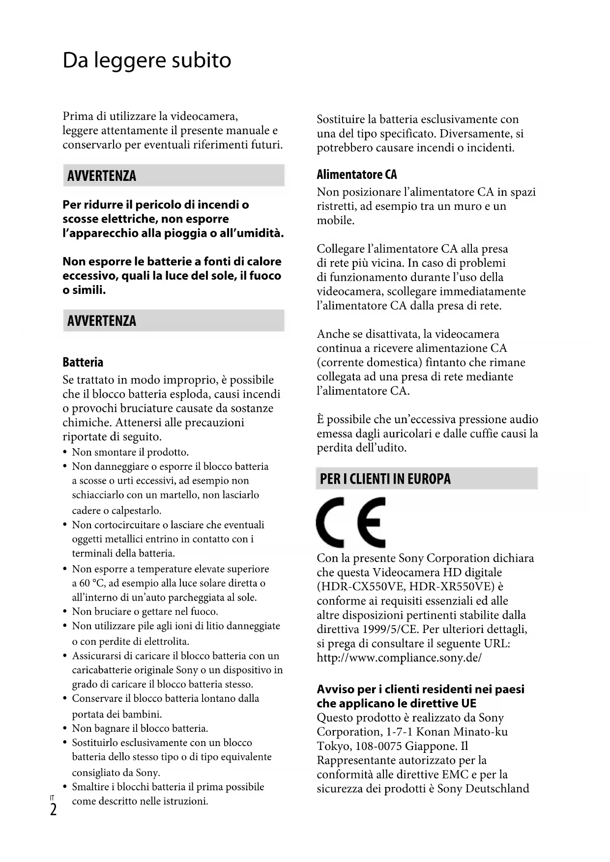 Da leggere subito Prima di utilizzare la videocamera, leggere attentamente il presente manuale e conservarlo per eventuali riferimenti futuri. AVVERTENZA Per ridurre il pericolo di incendi o scosse elettriche, non esporre l’apparecchio alla pioggia o all’umidità. Non esporre le batterie a fonti di calore eccessivo, quali la luce del sole, il fuoco o simili. AVVERTENZA Batteria Se trattato in modo improprio, è possibile che il blocco batteria esploda, causi incendi o provochi bruciature causate da sostanze chimiche. Attenersi alle precauzioni riportate di seguito. Non smontare il prodotto.Non danneggiare o esporre il blocco batteria a scosse o urti eccessivi, ad esempio non schiacciarlo con un martello, non lasciarlo cadere o calpestarlo.Non cortocircuitare o lasciare che eventuali oggetti metallici entrino in contatto con i terminali della batteria.Non esporre a temperature elevate superiore a 60 °C, ad esempio alla luce solare diretta o all’interno di un’auto parcheggiata al sole.Non bruciare o gettare nel fuoco.Non utilizzare pile agli ioni di litio danneggiate o con perdite di elettrolita.Assicurarsi di caricare il blocco batteria con un caricabatterie originale Sony o un dispositivo in grado di caricare il blocco batteria stesso.Conservare il blocco batteria lontano dalla portata dei bambini.Non bagnare il blocco batteria.Sostituirlo esclusivamente con un blocco batteria dello stesso tipo o di tipo equivalente consigliato da Sony.Smaltire i blocchi batteria il prima possibile come descritto nelle istruzioni.