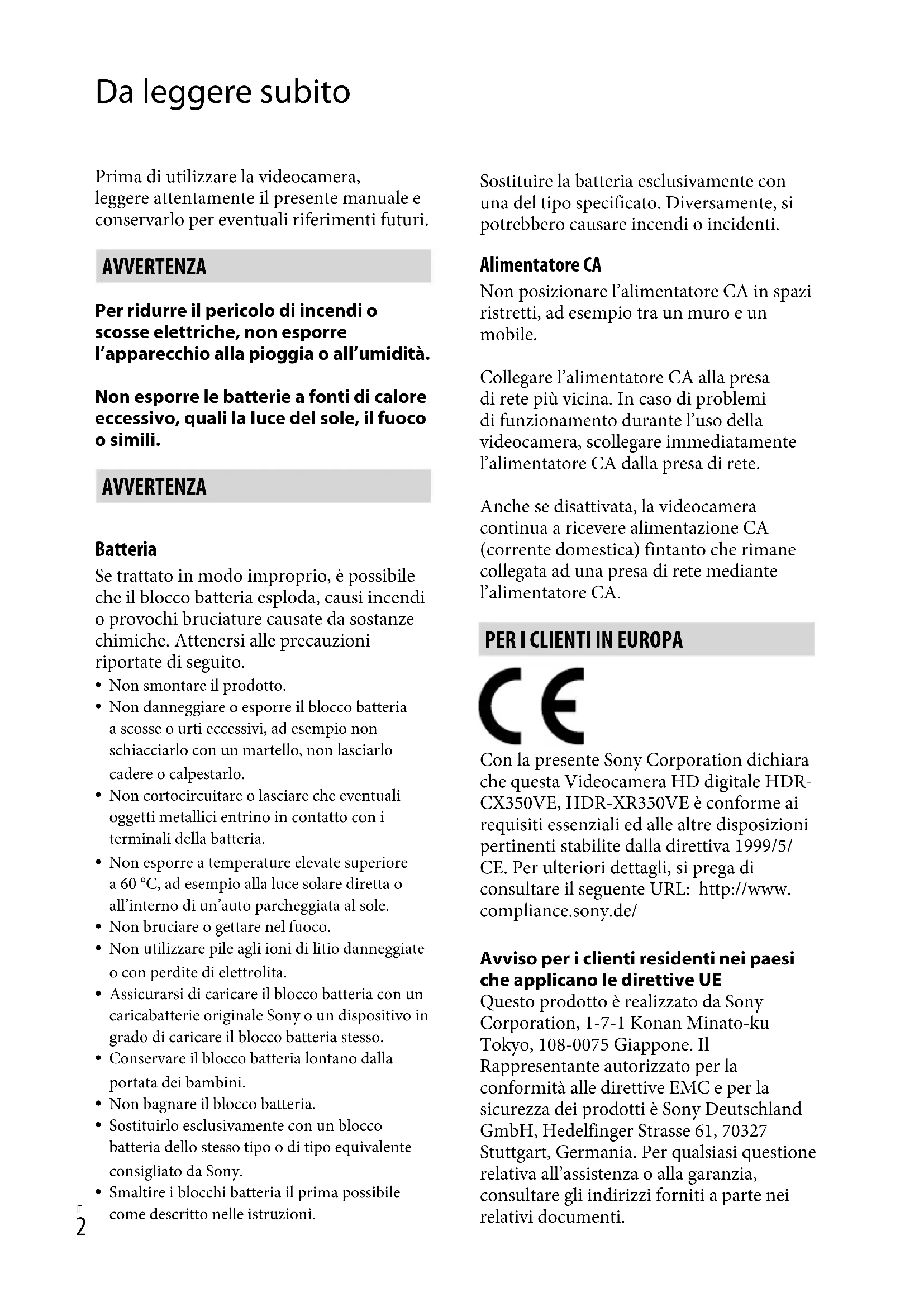 Da leggere subito Prima di utilizzare la videocamera, leggere attentamente il presente manuale e conservarlo per eventuali riferimenti futuri. AVVERTENZA Per ridurre il pericolo di incendi o scosse elettriche, non esporre l’apparecchio alla pioggia o all’umidità. Non esporre le batterie a fonti di calore eccessivo, quali la luce del sole, il fuoco o simili. AVVERTENZA Batteria Se trattato in modo improprio, è possibile che il blocco batteria esploda, causi incendi o provochi bruciature causate da sostanze chimiche. Attenersi alle precauzioni riportate di seguito. Non smontare il prodotto.Non danneggiare o esporre il blocco batteria a scosse o urti eccessivi, ad esempio non schiacciarlo con un martello, non lasciarlo cadere o calpestarlo.Non cortocircuitare o lasciare che eventuali oggetti metallici entrino in contatto con i terminali della batteria.Non esporre a temperature elevate superiore a 60 °C, ad esempio alla luce solare diretta o all’interno di un’auto parcheggiata al sole.Non bruciare o gettare nel fuoco.Non utilizzare pile agli ioni di litio danneggiate o con perdite di elettrolita.Assicurarsi di caricare il blocco batteria con un caricabatterie originale Sony o un dispositivo in grado di caricare il blocco batteria stesso.Conservare il blocco batteria lontano dalla portata dei bambini.Non bagnare il blocco batteria.Sostituirlo esclusivamente con un blocco batteria dello stesso tipo o di tipo equivalente consigliato da Sony.Smaltire i blocchi batteria il prima possibile come descritto nelle istruzioni.