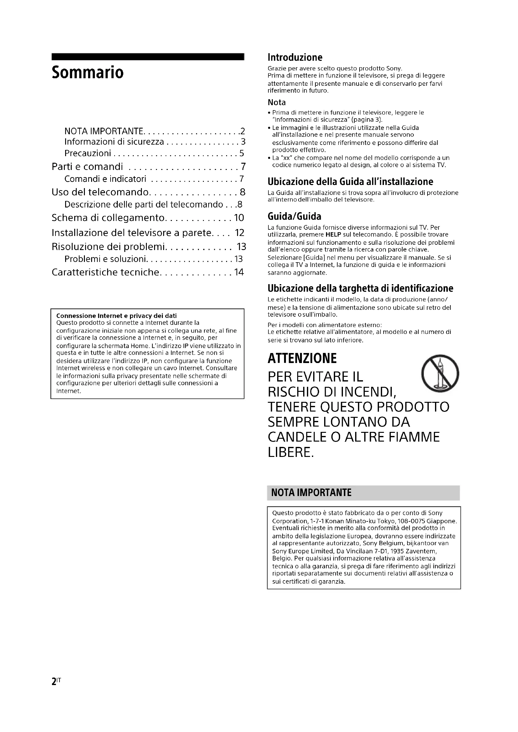LIBERE. NOTA IMPORTANTE Questo prodotto è stato fabbricato da o per conto di Sony Corporation, 1-7-1 Konan Minato-ku Tokyo, 108-0075 Giappone. Eventuali richieste in merito alla conformità del prodotto in ambito della legislazione Europea, dovranno essere indirizzate al rappresentante autorizzato, Sony Belgium, bijkantoor van Sony Europe Limited, Da Vincilaan 7-D1, 1935 Zaventem, Belgio. Per qualsiasi informazione relativa all'assistenza tecnica o alla garanzia, si prega di fare riferimento agli indirizzi riportati separatamente sui documenti relativi all'assistenza o sui certificati di garanzia.Connessione Internet e privacy dei datiQuesto prodotto si connette a Internet durante la configurazione iniziale non appena si collega una rete, al fine di verificare la connessione a Internet e, in seguito, per configurare la schermata Home. L’indirizzo IP viene utilizzato in questa e in tutte le altre connessioni a Internet. Se non si desidera utilizzare l’indirizzo IP, non configurare la funzione Internet wireless e non collegare un cavo Internet. Consultare le informazioni sulla privacy presentate nelle schermate di configurazione per ulteriori dettagli sulle connessioni a Internet.3