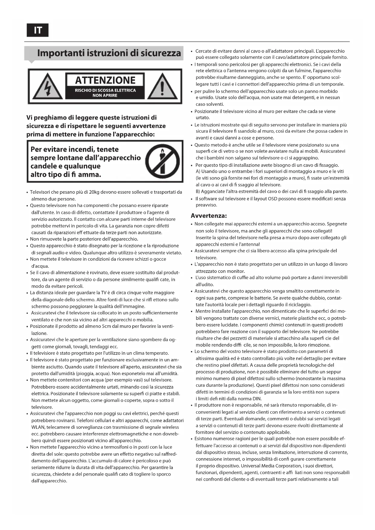 - Mentre installate l'apparecchio, non dimenticate che le super ci dei mo- bili vengono trattate con diverse vernici, materie plastiche ecc, opotreb-bero essere lucidate. Icomponenti chimici contenuti in questi prodotti potrebbero fare reazione con il supporto del televisore. Ne potrebbe risultare che dei pezzetti di materiale si attacchino alla super cie del mobile rendendo di cile, se non impossibile, la loro rimozione.• Lo schermo del vostro televisore è stato prodotto con parametri di altissima qualità ed è stato controllato più volte nel dettaglio per evitare che restino pixel difettati. Acausa delle proprietà tecnologiche del processo di produzione, non è possibile eliminare del tutto un seppur minimo numero di pixel difettosi sullo schermo (nonostante la massima cura durante la produzione). Questi pixel difettosi non sono considerati difetti in termini di condizioni di garanzia se la loro entità non supera ilimiti de niti dalla norma DIN.• Il produttore non è responsabile, né sarà ritenuto responsabile, di in-convenienti legati al servizio clienti con riferimento a servizi o contenuti di terze parti. Eventuali domande, commenti o dubbi sui servizi legati a servizi o contenuti di terze parti devono essere rivolti direttamente al fornitore del servizio o contenuto applicabile.• Esistono numerose ragioni per le quali potrebbe non essere possibile ef-fettuare l'accesso ai contenuti o ai servizi dal dispositivo non dipendenti dal dispositivo stesso, incluse, senza limitazione, interruzione di corrente, connessione internet, o impossibilità di con gurare correttamente il proprio dispositivo. Universal Media Corporation, i suoi direttori, funzionari, dipendenti, agenti, contraenti e a liati non sono responsabili nei confronti del cliente o di eventuali terze parti relativamente a tali29 inconvenienti o interruzioni di manutenzione, indipendentemente dalla causa o dal fatto che possano essere evitate o meno.