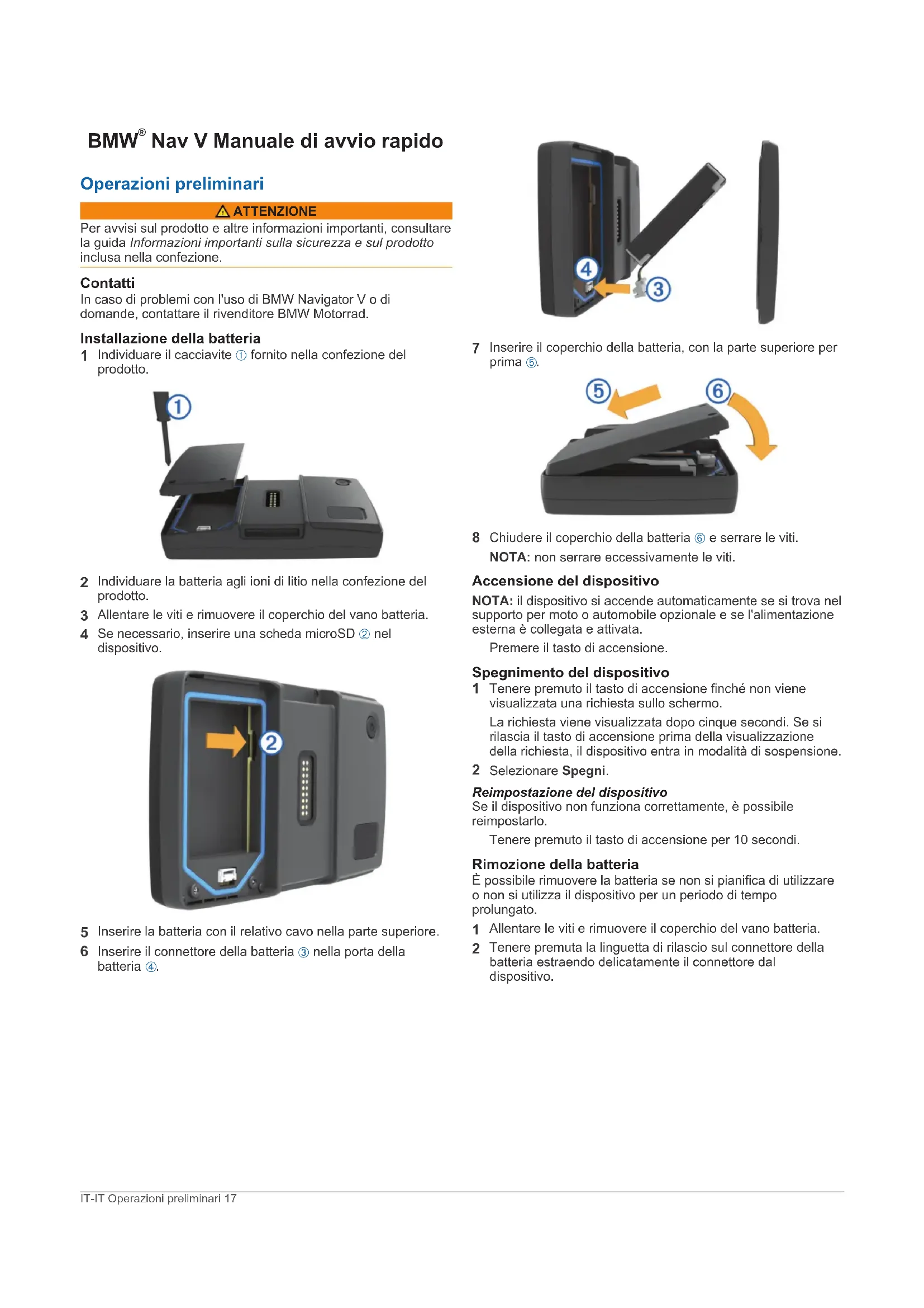 Nav V Manuale di avvio rapido Operazioni preliminari ATTENZIONE Per avvisi sul prodotto e altre informazioni importanti, consultare la guida Informazioni importanti sulla sicurezza e sul prodotto inclusa nella confezione. Contatti In caso di problemi con l'uso di BMW Navigator V o di domande, contattare il rivenditore BMW Motorrad. Installazione della batteria
