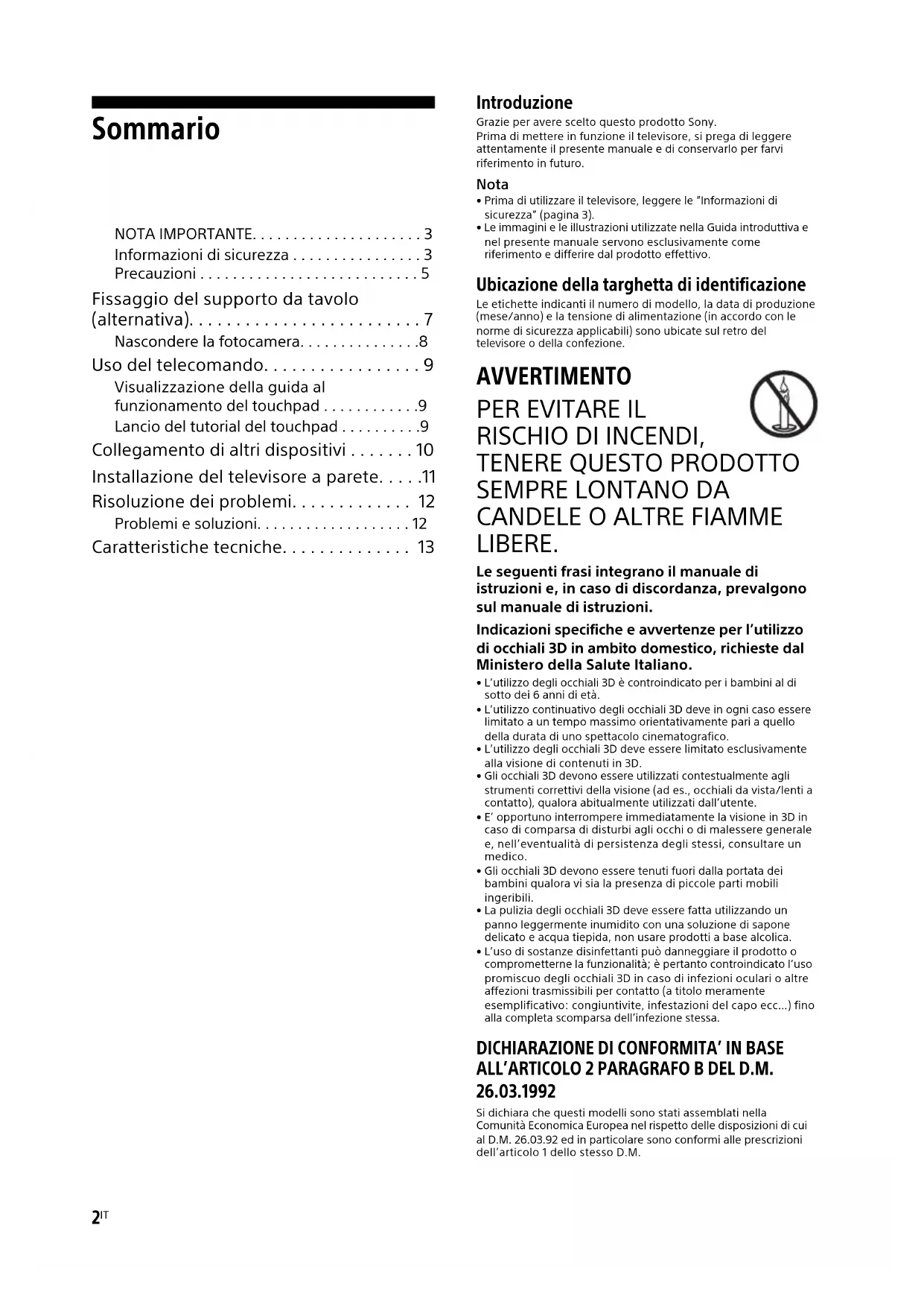 - La visione di immagini video 3D o l’utilizzo di videogiochi stereoscopici in 3D può causare disturbi (sforzo visivo eccessivo, affaticamento, nausea) in alcune persone. Sony consiglia a tutti gli utilizzatori di effettuare pause regolari durante la visione di immagini 3D o durante l’utilizzo di videogiochi stereoscopici in 3D. La durata e la frequenza delle pause necessarie variano da una persona all’altra. Le scelte ottimali devono essere prese in autonomia. Se si avverte un qualsiasi disturbo, la visione di immagini 3D o l’utilizzo di videogiochi stereoscopici in 3D vanno interrotti fino alla scomparsa del disturbo; se lo si ritiene opportuno, consultare un medico. Consultare inoltre (i) il manuale di istruzioni di qualsiasi altro dispositivo o supporto utilizzato insieme al televisore e (ii) il nostro sito Web (http://support.sony-europe.com/) per le ultime informazioni. La visione da parte dei bambini piccoli (in particolare, quelli sotto i sei anni di età) è ancora in fase di studio. Consultare un medico (un pediatra o un oculista) prima di consentire ai bambini piccoli la visione di immagini video 3D o l’utilizzo di videogiochi stereoscopici in 3D. Gli adulti sono tenuti a verificare che i bambini piccoli seguano le indicazioni riportate sopra.