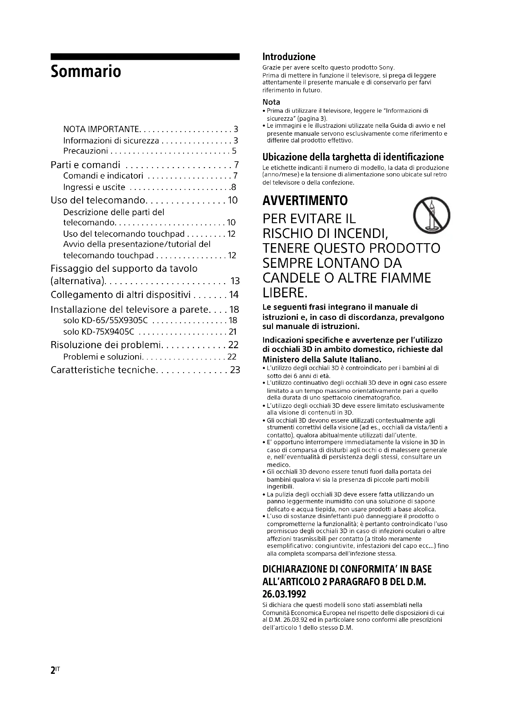 - La visione di immagini video 3D o l’utilizzo di videogiochi stereoscopici in 3D può causare disturbi (sforzo visivo eccessivo, affaticamento, nausea) in alcune persone. Sony consiglia a tutti gli utilizzatori di effettuare pause regolari durante la visione di immagini 3D o durante l’utilizzo di videogiochi stereoscopici in 3D. La durata e la frequenza delle pause necessarie variano da una persona all’altra. Le scelte ottimali devono essere prese in autonomia. Se si avverte un qualsiasi disturbo, la visione di immagini 3D o l’utilizzo di videogiochi stereoscopici in 3D vanno interrotti fino alla scomparsa del disturbo; se lo si ritiene opportuno, consultare un medico. Consultare inoltre (i) il manuale di istruzioni di qualsiasi altro dispositivo o supporto utilizzato insieme al televisore e (ii) il nostro sito Web (www.sony.eu/support) per le ultime informazioni. La visione da parte dei bambini piccoli (in particolare, quelli sotto i sei anni di età) è ancora in fase di studio. Consultare un medico (un pediatra o un oculista) prima di consentire ai bambini piccoli la visione di immagini video 3D o l’utilizzo di videogiochi stereoscopici in 3D. Gli adulti sono tenuti a verificare che i bambini piccoli seguano le indicazioni riportate sopra.