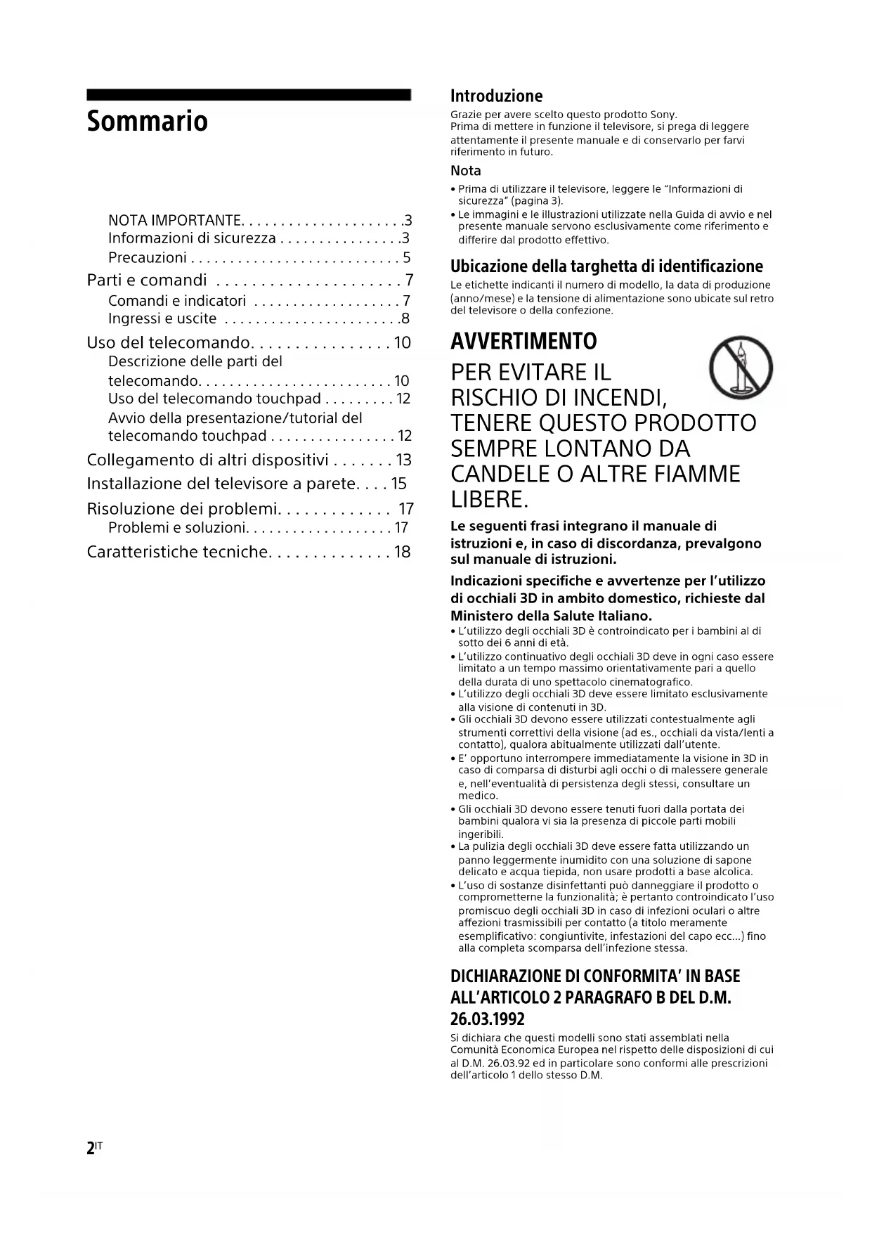 - La visione di immagini video 3D o l’utilizzo di videogiochi stereoscopici in 3D può causare disturbi (sforzo visivo eccessivo, affaticamento, nausea) in alcune persone. Sony consiglia a tutti gli utilizzatori di effettuare pause regolari durante la visione di immagini 3D o durante l’utilizzo di videogiochi stereoscopici in 3D. La durata e la frequenza delle pause necessarie variano da una persona all’altra. Le scelte ottimali devono essere prese in autonomia. Se si avverte un qualsiasi disturbo, la visione di immagini 3D o l’utilizzo di videogiochi stereoscopici in 3D vanno interrotti fino alla scomparsa del disturbo; se lo si ritiene opportuno, consultare un medico. Consultare inoltre (i) il manuale di istruzioni di qualsiasi altro dispositivo o supporto utilizzato insieme al televisore e (ii) il nostro sito Web (www.sony.eu/support) per le ultime informazioni. La visione da parte dei bambini piccoli (in particolare, quelli sotto i sei anni di età) è ancora in fase di studio. Consultare un medico (un pediatra o un oculista) prima di consentire ai bambini piccoli la visione di immagini video 3D o l’utilizzo di videogiochi stereoscopici in 3D. Gli adulti sono tenuti a verificare che i bambini piccoli seguano le indicazioni riportate sopra.