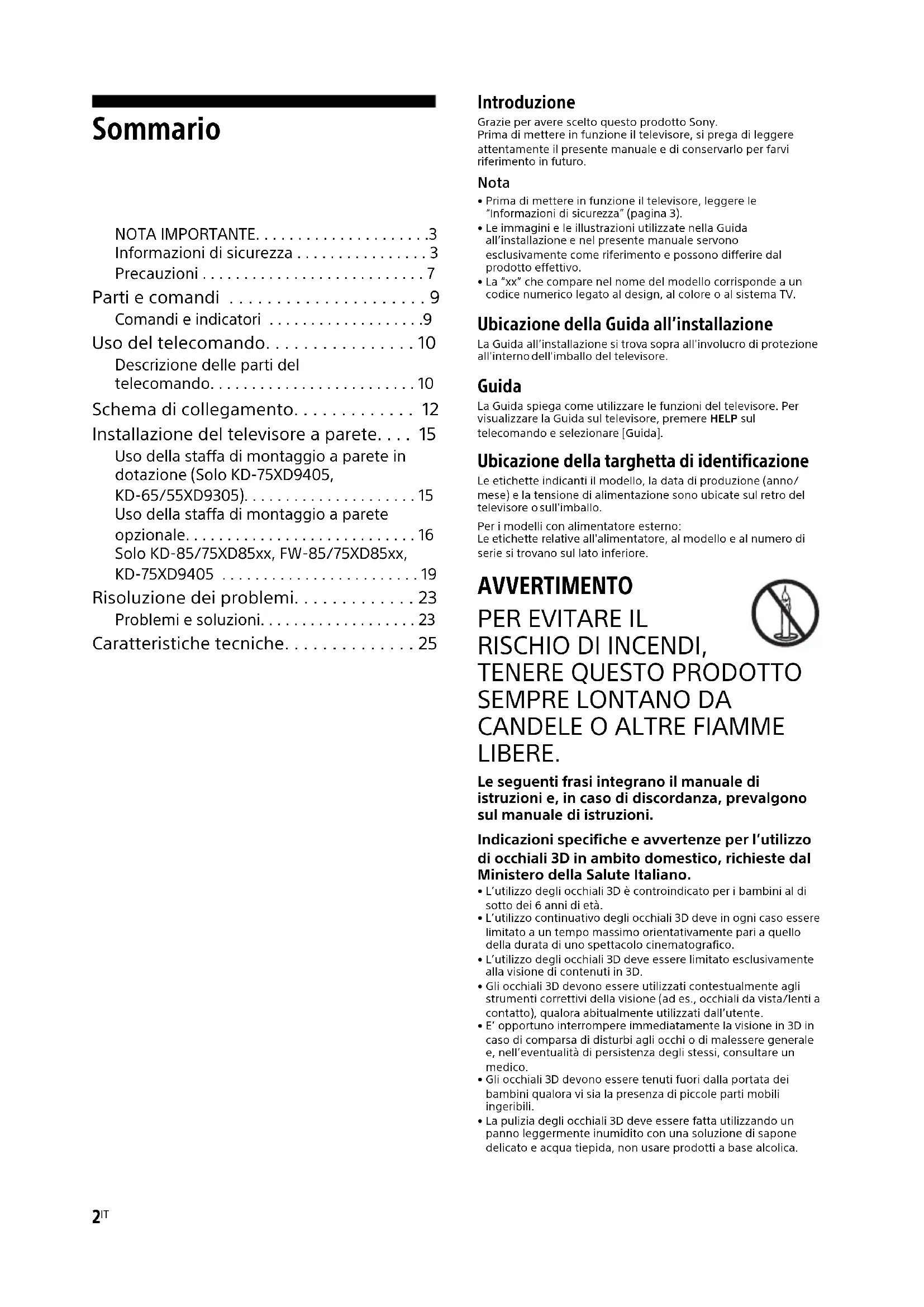 D:\_SONY TV\SY150217_QH 85 EU RG\4584644151\07_4584644151_IT\010COVTOC_IT.fm masterpage: Left KD-85XD85xx / 75XD9405 / 75XD85xx / 65XD9305 / 65XD85xx / 55XD9305 / 55XD85xx / FW-85XD85xx / 75XD85xx / 65XD85xx / 55XD85xx 4-584-644-15(1) NOTA SULL’ALIMENTATORE (solo per i modelli con alimentatore esterno) Attenzione Per ridurre il rischio di incendi o scosse elettriche, non esporre questo apparato alla pioggia o all’umidità. Per evitare il rischio di incendi o scosse elettriche, non appoggiare sull’apparecchio oggetti contenenti liquidi, come vasi o simili. Non installare l’apparecchio in uno spazio chiuso, come una libreria o mobili simili.