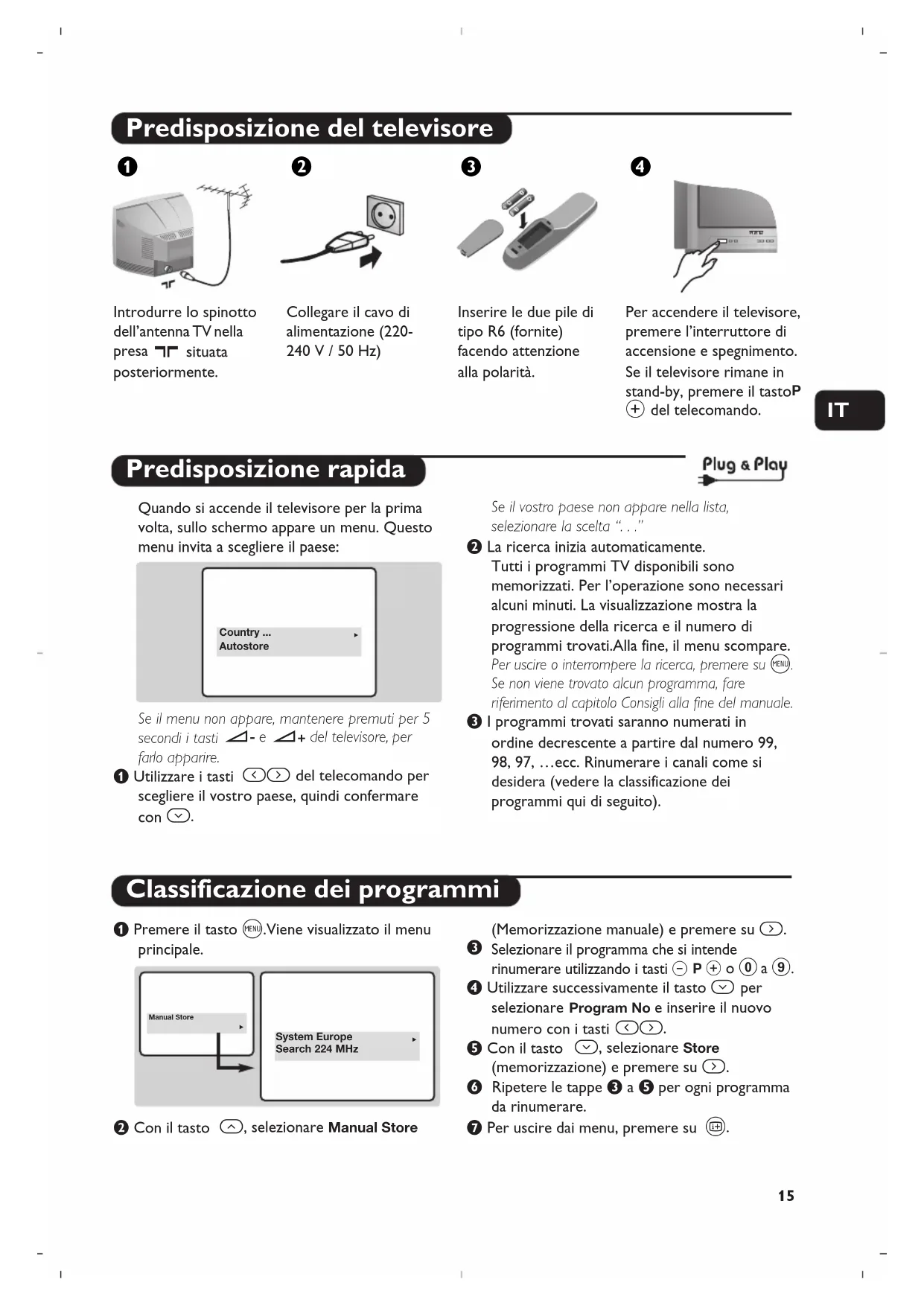 Se il vostro paese non appare nella lista, selezionare la scelta “. . .” é La ricerca inizia automaticamente. Tutti i programmi TV disponibili sono memorizzati. Per l’operazione sono necessari alcuni minuti. La visualizzazione mostra la progressione della ricerca e il numero di programmi trovati.Alla fine, il menu scompare. Per uscire o interrompere la ricerca, premere su H. Se non viene trovato alcun programma, fare riferimento al capitolo Consigli alla fine del manuale. “ I programmi trovati saranno numerati in ordine decrescente a partire dal numero 99, 98, 97, …ecc. Rinumerare i canali come si desidera (vedere la classificazione dei programmi qui di seguito). & Premere il tasto H.Viene visualizzato il menu principale. é Con il tasto î, selezionare Manual Store (Memorizzazione manuale) e premere su ¬.
