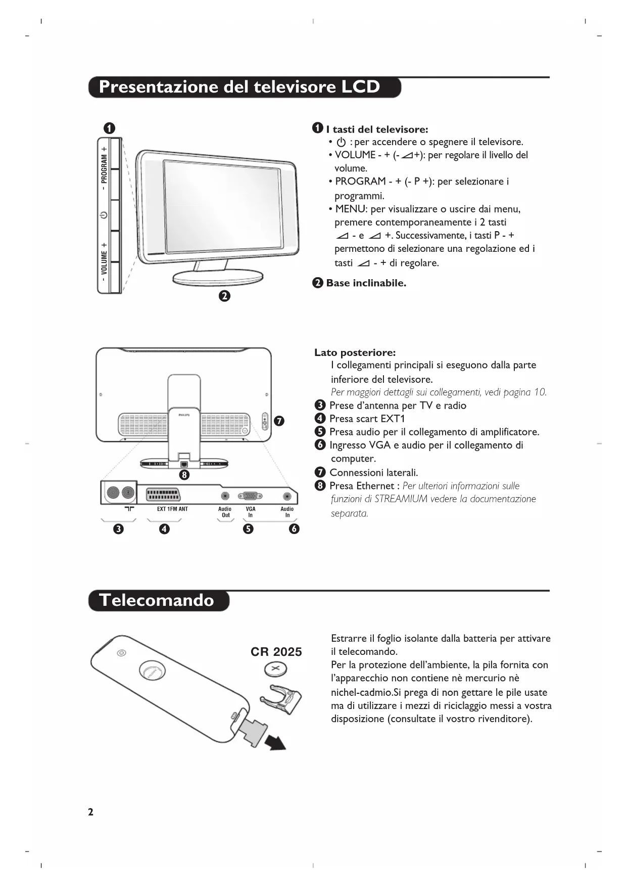 Base inclinabile. Lato posteriore: I collegamenti principali si eseguono dalla parte inferiore del televisore. Per maggiori dettagli sui collegamenti, vedi pagina 10. “ Prese d’antenna per TV e radio ‘ Presa scart EXT1 ( Presa audio per il collegamento di amplificatore. § Ingresso VGA e audio per il collegamento di computer. è Connessioni laterali. ! Presa Ethernet : Per ulteriori informazioni sulle funzioni di STREAMIUM vedere la documentazione separata. Estrarre il foglio isolante dalla batteria per attivare il telecomando. Per la protezione dell’ambiente, la pila fornita con l’apparecchio non contiene nè mercurio nè nichel-cadmio.Si prega di non gettare le pile usate ma di utilizzare i mezzi di riciclaggio messi a vostra disposizione (consultate il vostro rivenditore). CR 20253 I tasti del telecomando Tasto televideo (p.8) Selezione prese EXT (p.10) Premere più volte per selezionare la sorgente esterna collegato. Modo suono Permette di forzare le trasmissioni Stereo e Nicam Stereo in Mono o, per le trasmissioni bilingua, di scegliere tra Dual I o Dual II. La spia Mono è rossa quando c’è una posizione forzata. Tasto non utilizzato. TV / PC / Radio Premere uno di questi tasti per commutare il televisore in modo TV, PC o radio (p. 9). Cursore ( SU/GIÙ/ SINISTRA/DESTRA) Questi 4 tasti permettono di navigare nei menu . Formato 16:9 (p. 7) Interruzione audio Per eliminare o ripristinare l’audio. Volume Per regolare il livello audio. Preregolazioni immagine e suono Permette di accedere ad una serie di preregolazioni per immagine e suono. La posizione Personale corrisponde alle regolazioni effettuate nei menu. Inform. schermo Per visualizzare / rimuovere il numero di programma, l’ora,il tipo di audio,il tempo rimasto del timer. Per la visualizzazione continua del numero di programma allo schermo, premere questo tasto per 5 secondi. Stato di attesa Per selezionare il modo Stato di attesa. Per riaccendere il televisore, premere .,P - + o ñ/ô. Selettore di modo * Programma precedente Per accedere al programma selezionato precedentemente. Suono surround Per attivare / disattivare l’effetto espansione dell’audio.In stereo, gli altoparlanti sembrano avere uno spazialità maggiore. Per le versioni dotate del Virtual Dolby Surround *, otterrete gli effetti sonori speciali dalle casse posteriori del Dolby Surround Pro Logic. Active Control Ottimizza la qualità dell’immagine in funzione del segnale e della luce ambiente. Menu Per richiamare i menu o uscire dagli stessi. Selezione dei programmi TV Per selezionare il programma precedente o il programma seguente. Il numero, e il suono vengono visualizzati iper pochi secondi. In alcuni programmi con televideo, il titolo del programma appare sullo schermo in basso. Tasti numerici Per accedere direttamente ai programmi. Per un numero di programma a 2 cifre, aggiungere la seconda cifra prima che il trattino scompaia. Richiamo televideo (p. 8).