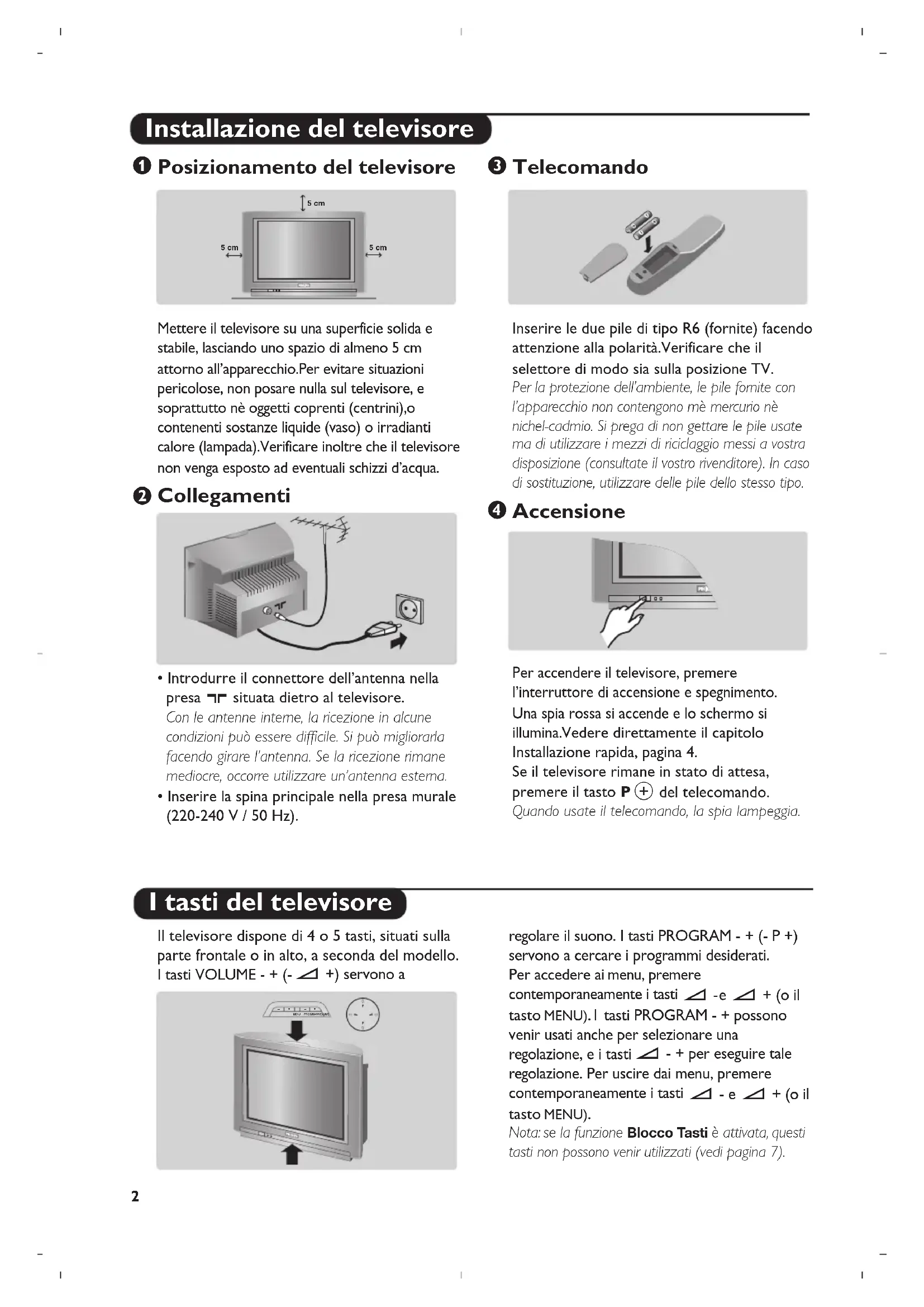 Telecomando Inserire le due pile di tipo R6 (fornite) facendo attenzione alla polarità.Verificare che il selettore di modo sia sulla posizione TV. Per la protezione dell’ambiente, le pile fornite con l’apparecchio non contengono mè mercurio nè nichel-cadmio. Si prega di non gettare le pile usate ma di utilizzare i mezzi di riciclaggio messi a vostra disposizione (consultate il vostro rivenditore). In caso di sostituzione, utilizzare delle pile dello stesso tipo.