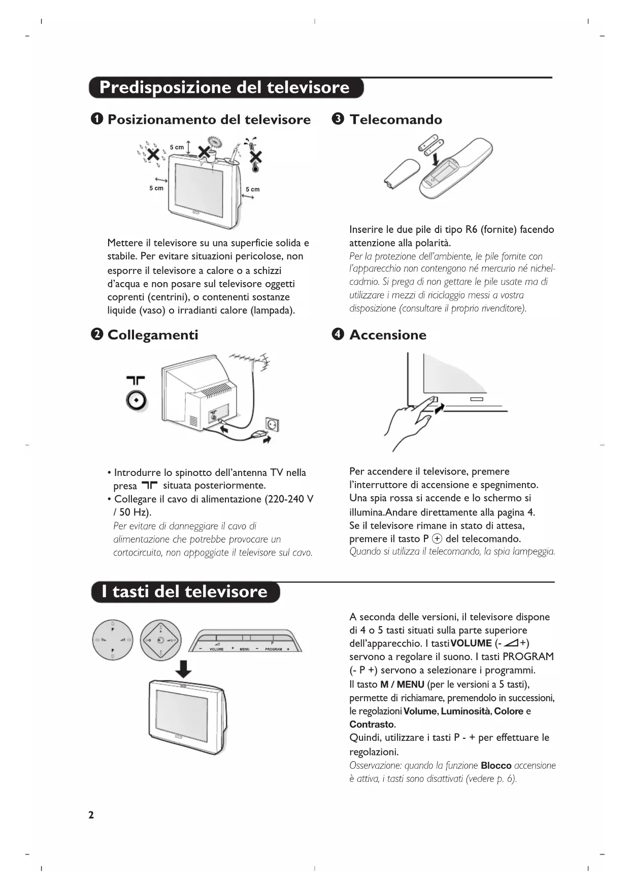 Direttive per il riciclaggio Il Vostro televisore è composto da materiali riutilizzabili o riciclabili. Per ridurre al minimo la dispersione di rifiuti nell’ambiente, alcune imprese specializzate ritirano gli apparecchi usati per smontarli e recuperare i pezzi riutilizzabili (informarsi presso il rivenditore). Italiano2 A seconda delle versioni, il televisore dispone di 4 o 5 tasti situati sulla parte superiore dell’apparecchio. I tasti VOLUME (-”+) servono a regolare il suono. I tasti PROGRAM (- P +) servono a selezionare i programmi. Il tasto M / MENU (per le versioni a 5 tasti), permette di richiamare, premendolo in successioni, le regolazioni Volume,Luminosità,Colore e Contrasto. Quindi, utilizzare i tasti P - + per effettuare le regolazioni. Osservazione: quando la funzione Blocco accensione è attiva, i tasti sono disattivati (vedere p. 6).