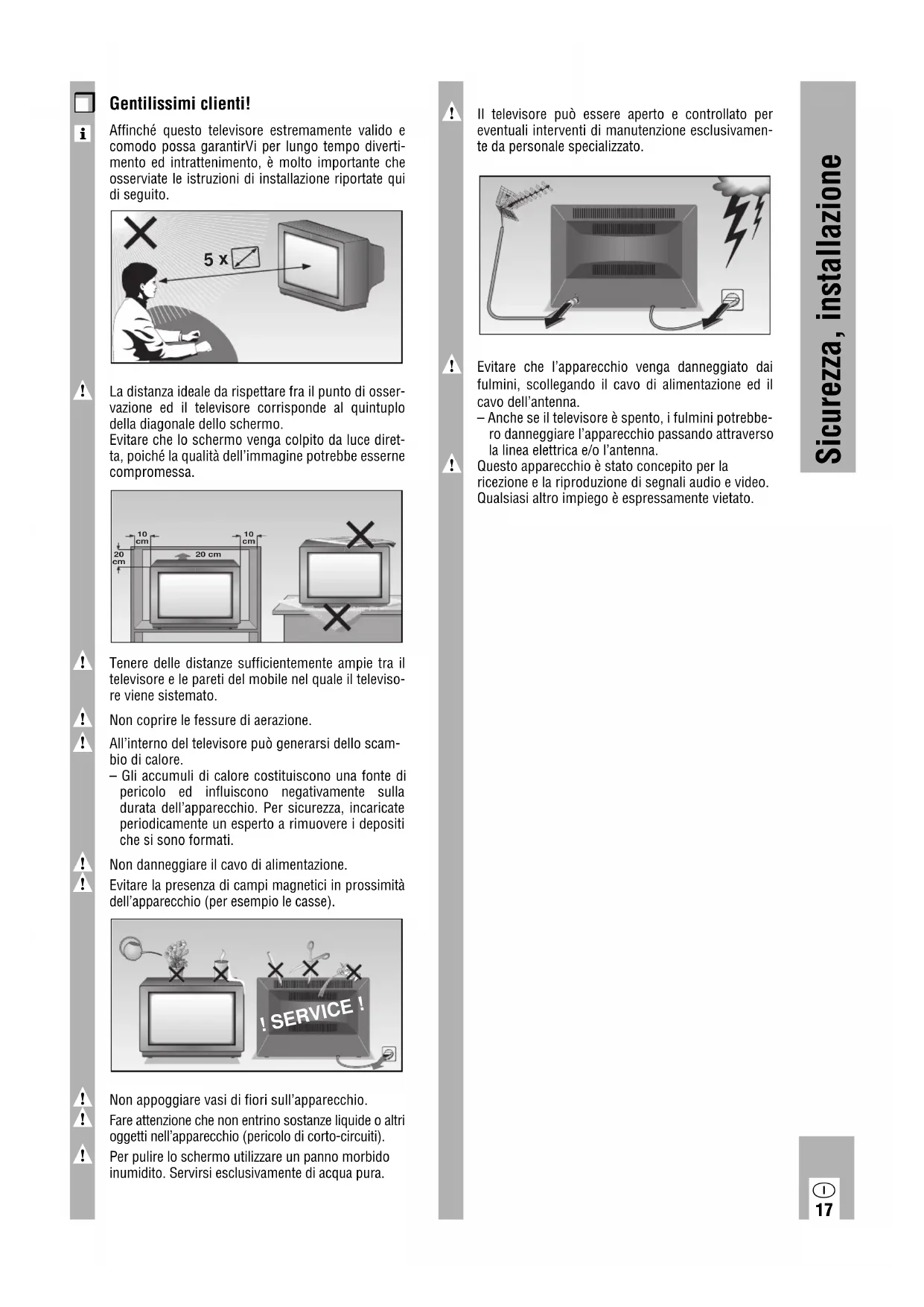 Questo apparecchio è stato concepito per laricezione e la riproduzione di segnali audio e video.Qualsiasi altro impiego è espressamente vietato. Gentilissimi clienti!Affinché questo televisore estremamente valido ecomodo possa garantirVi per lungo tempo diverti-mento ed intrattenimento, è molto importante cheosserviate le istruzioni di installazione riportate quidi seguito.