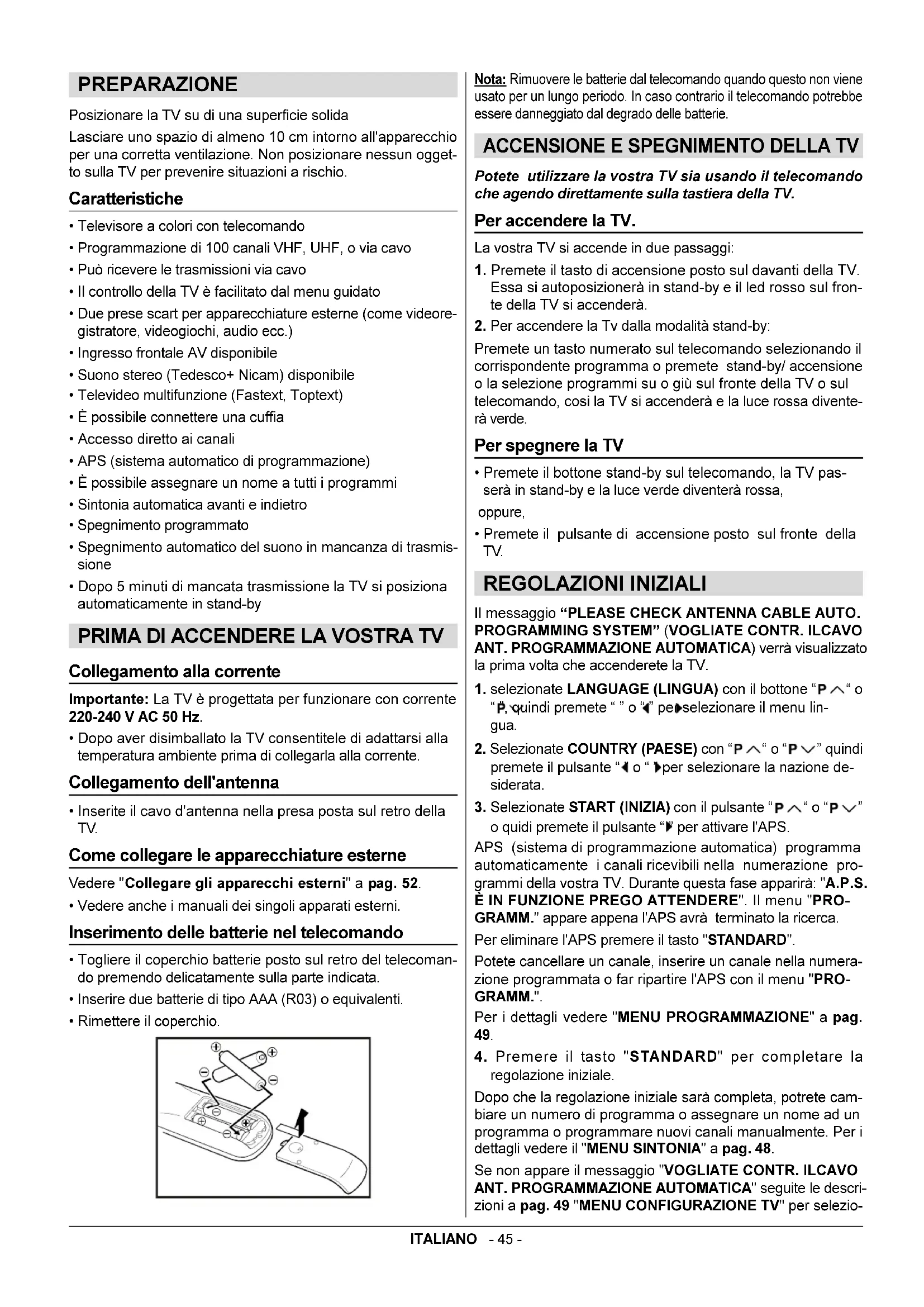 Premete un tasto numerato sul telecomando selezionando il corrispondente programma o premete stand-by/ accensione o la selezione programmi su o giù sul fronte della TV o sul telecomando, cosi la TV si accenderà e la luce rossa divente- rà verde. Per spegnere la TV Premete il bottone stand-by sul telecomando, la TV pas- serà in stand-by e la luce verde diventerà rossa, oppure, Premete il pulsante di accensione posto sul fronte della TV. REGOLAZIONI INIZIALI Il messaggio PLEASE CHECK ANTENNA CABLE AUTO.