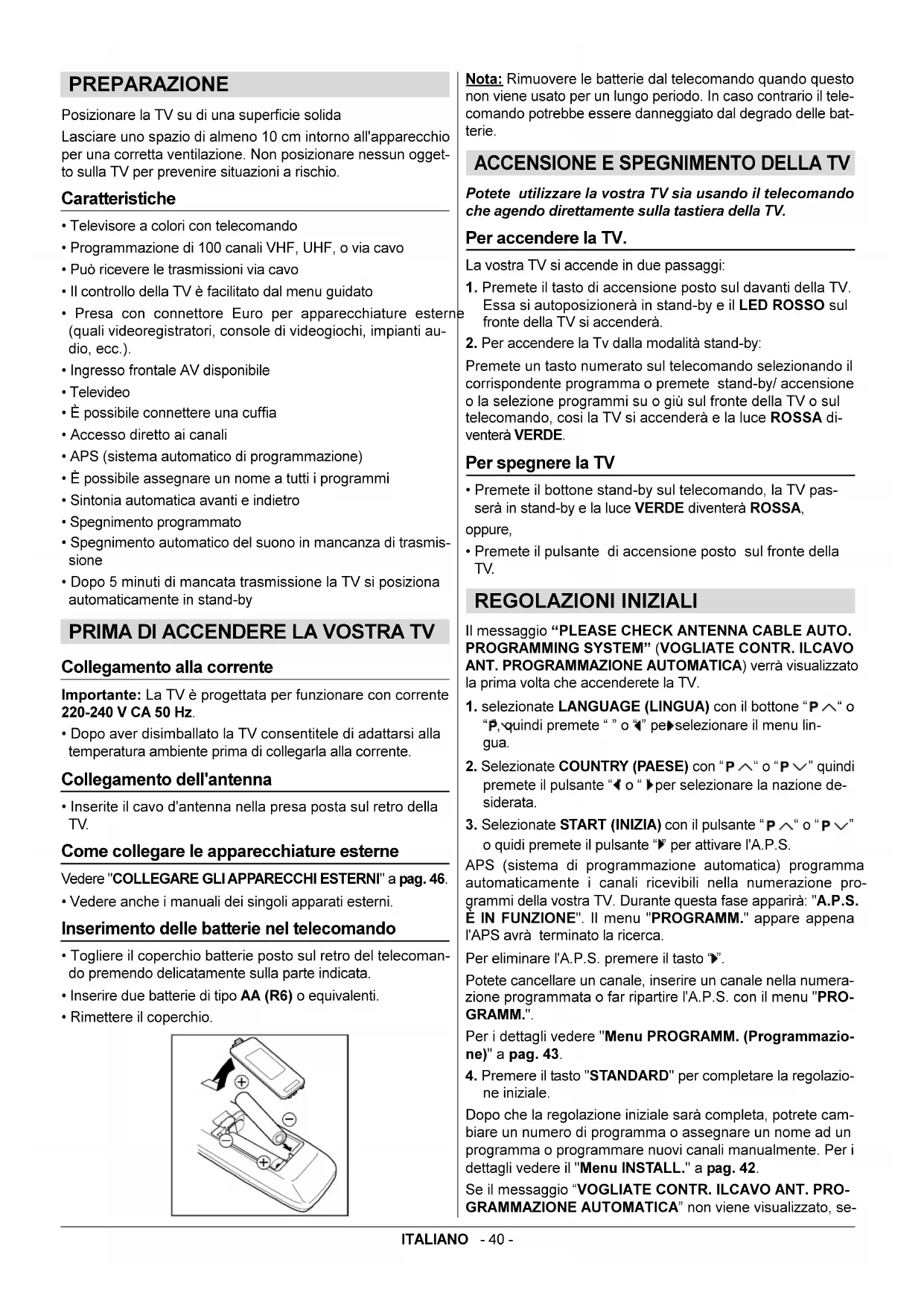 Premete un tasto numerato sul telecomando selezionando il corrispondente programma o premete stand-by/ accensione o la selezione programmi su o giù sul fronte della TV o sul telecomando, cosi la TV si accenderà e la luce ROSSA di- venterà VERDE. Per spegnere la TV Premete il bottone stand-by sul telecomando, la TV pas- serà in stand-by e la luce VERDE diventerà ROSSA, oppure, Premete il pulsante di accensione posto sul fronte della TV. REGOLAZIONI INIZIALI Il messaggio PLEASE CHECK ANTENNA CABLE AUTO.