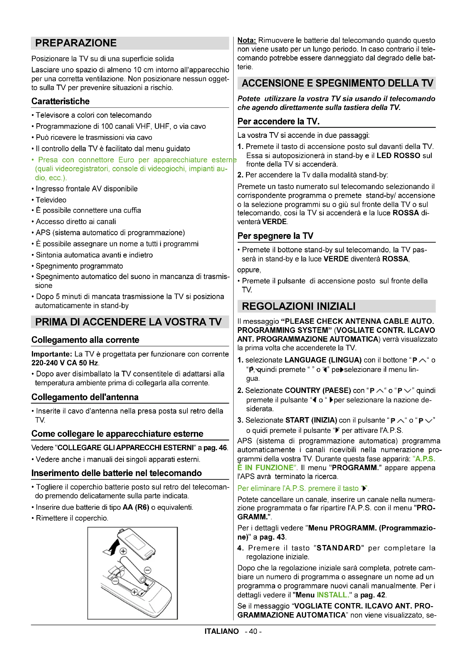 Premete un tasto numerato sul telecomando selezionando il corrispondente programma o premete stand-by/ accensione o la selezione programmi su o giù sul fronte della TV o sul telecomando, cosi la TV si accenderà e la luce ROSSA di- venterà VERDE. Per spegnere la TV Premete il bottone stand-by sul telecomando, la TV pas- serà in stand-by e la luce VERDE diventerà ROSSA, oppure, Premete il pulsante di accensione posto sul fronte della TV. REGOLAZIONI INIZIALI Il messaggio PLEASE CHECK ANTENNA CABLE AUTO.