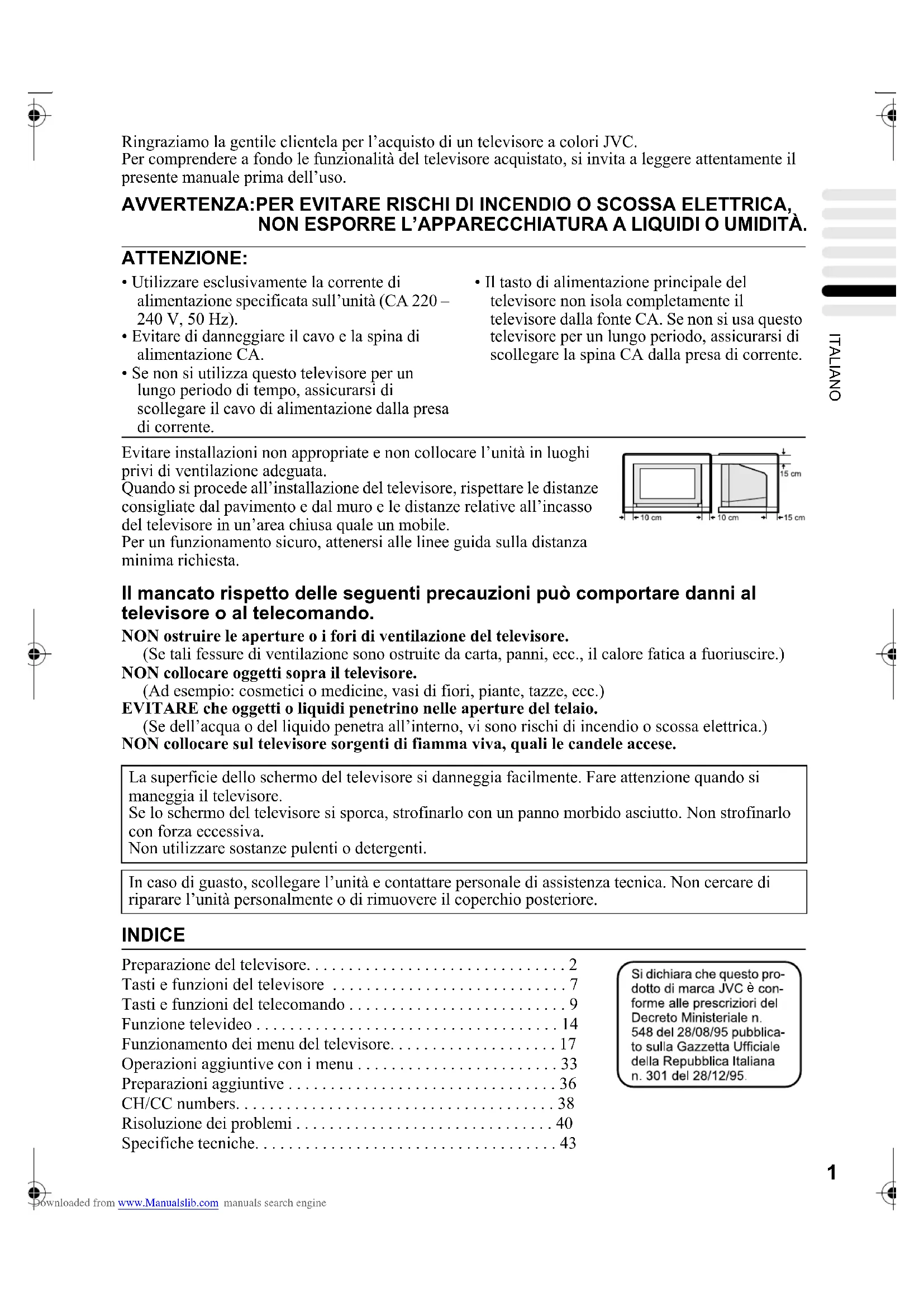 AV32&28H20EU_Ita.fm Page 1 Wednesday, February 20, 2002 2:06 PM Downloaded from www.Manualslib.com manuals search engine2 AV32/28X25EU / AV32/28H20EU / AV28CH1EU / LCT1142-001A-U / Italiano Preparazione del televisore Attenzione