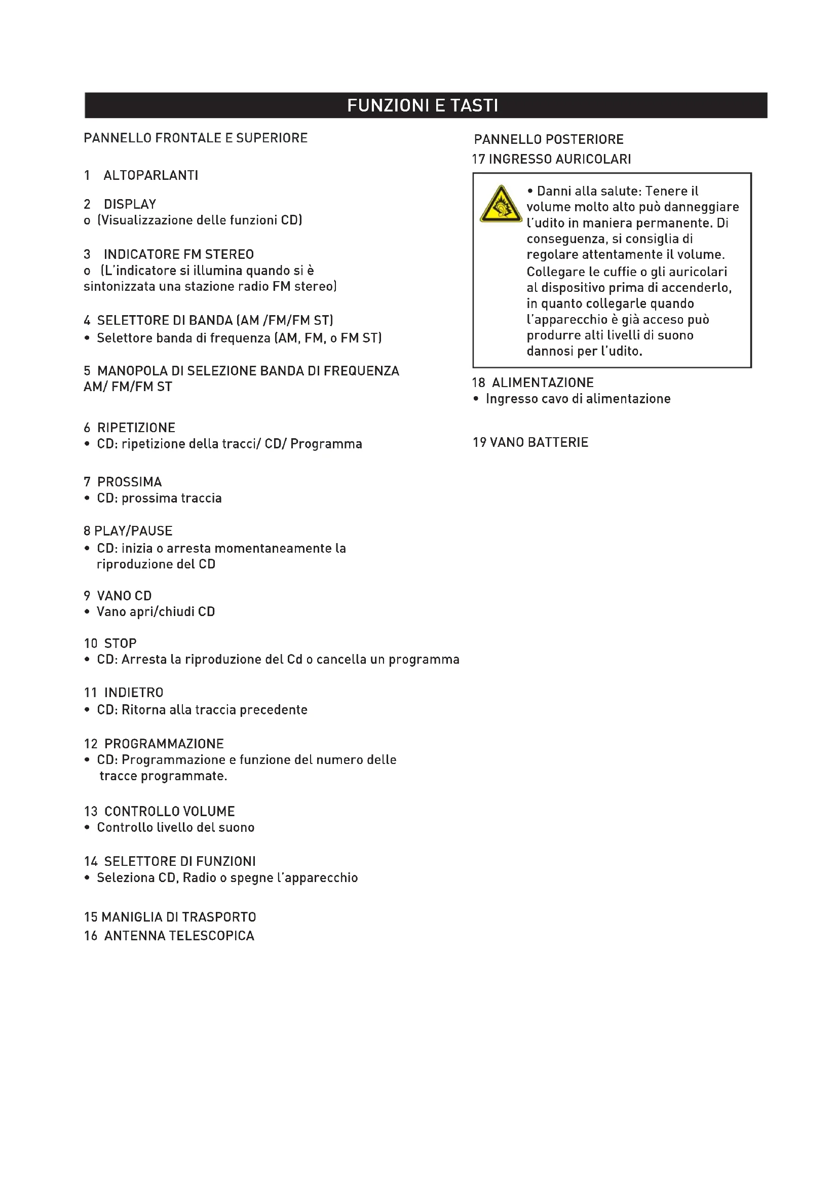 - Collegamento all’alimentazione: non utilizzare il dispositivo se esso o i suoi cavi presentano danni visibili. collegare il dispositivo solo a fonti d’alimentazione con la tensione corrispondente a quella indicata sull’etichetta sul prodotto. Non collegare mai il dispositivo a tensioni diverse. Collegare il dispositivo a prese dotate di messa a terra conformi ai relativi standard di sicurezza. Non piegare o schiacciare i cavi. ATTENZIONE! All’interno del dispositivo sono presenti alte tensioni. Non aprire il case del dispositivo: rischio di scosse elettriche. Per scollegare completamente il dispositivo dall’alimentazione, estrarre la spina dalla presa. Estrarre sempre il cavo dalla presa impugnando la spina e non tirando il cavo. Le tempeste elettriche possono danneg- giare i dispositivi elettrici; di conseguenza, durante i temporali si consiglia di scollegare il dispositivo dall’alimentazione Inoltre, se si prevede di non utilizzare il dispositivo per lungo tempo, si consiglia di scolle- galo dall’alimentazione e di rimuovere le batterie.FUNZIONI E TASTI Funzione CD