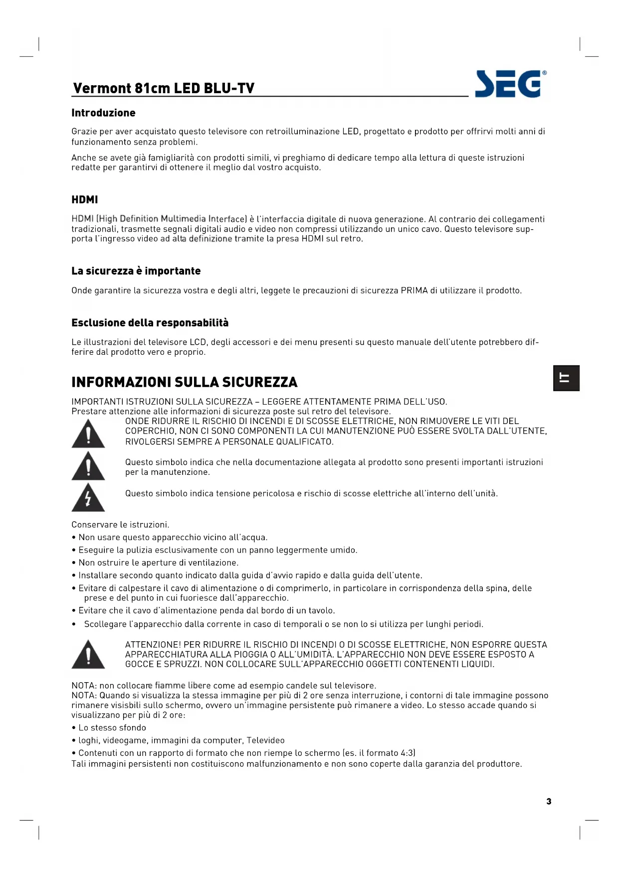 Scarica le istruzioni per il tuo Televisore in formato PDF gratuitamente! Trova il tuo manuale Vermont - SEG e riprendi in mano il tuo dispositivo elettronico. In questa pagina sono pubblicati tutti i documenti necessari per l'utilizzo del tuo dispositivo. Vermont del marchio SEG.