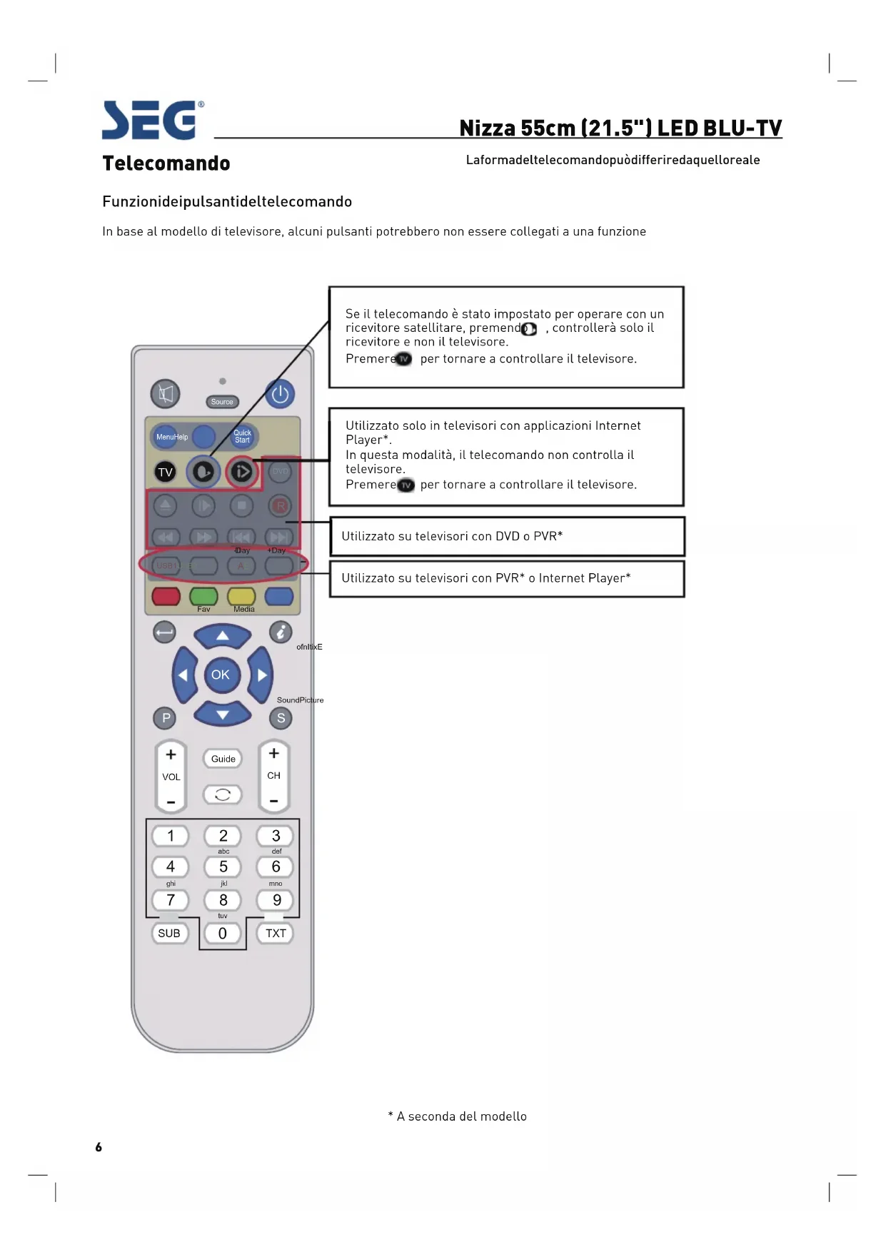 Utilizzato solo in televisori con applicazioni Internet Player*. In questa modalità, il telecomando non controlla il televisore. Premere per tornare a controllare il televisore. Se il telecomando è stato impostato per operare con un ricevitore satellitare, premendo , controllerà solo il ricevitore e non il televisore. Premere per tornare a controllare il televisore. Utilizzato su televisori con DVD o PVR* Utilizzato su televisori con PVR* o Internet Player* zyxwsrqp Nizza 55cm (21.5") LED BLU-TV7