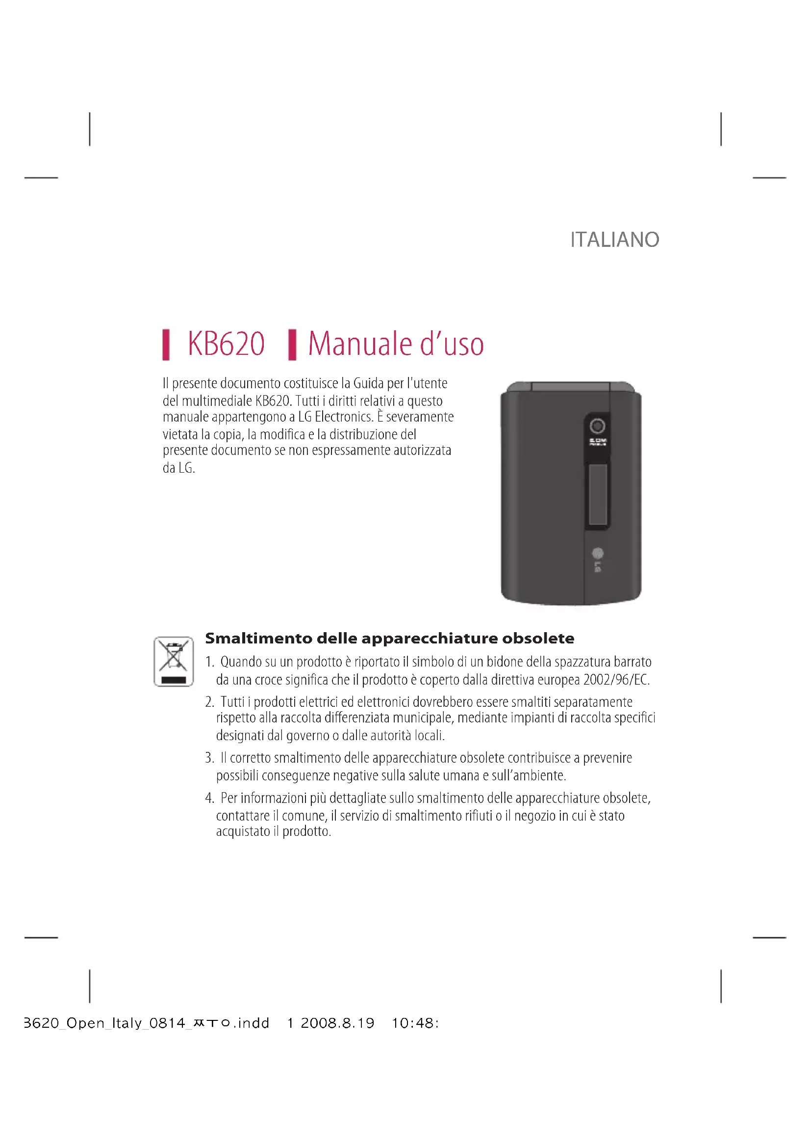 contattare il comune, il servizio di smaltimento rifiuti o il negozio in cui è stato acquistato il prodotto. Il presente documento costituisce la Guida per l'utente del multimediale KB620. Tutti i diritti relativi a questo manuale appartengono a LG Electronics. È severamente vietata la copia, la modifica e la distribuzione del presente documento se non espressamente autorizzata da LG. KB620_Open_Italy_0814_쭝.indd 1 2008.8.19 10:48:52 AM2 Sommario So mmario KB620 Funzioni 5 Componenti del telefono Introduzione 8 Inserimento della scheda SIM e della batteria Accensione/spegnimento del telefono 1