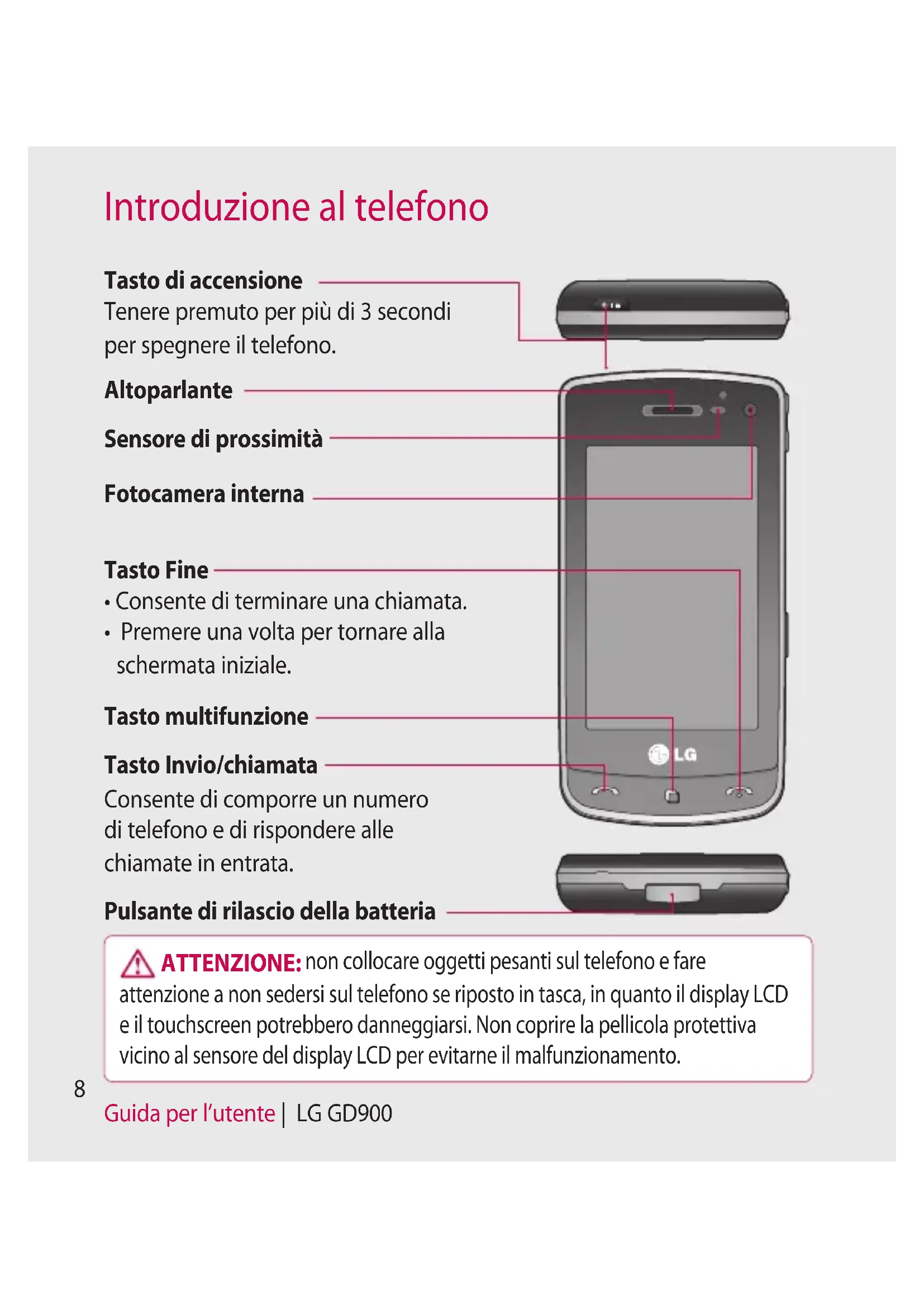 - Risoluzione dei problemi Guida per l’utente | LG GD900 Introduzione al telefono ATTENZIONE: non collocare oggetti pesanti sul telefono e fare attenzione a non sedersi sul telefono se riposto in tasca, in quanto il display LCD e il touchscreen potrebbero danneggiarsi. Non coprire la pellicola protettiva vicino al sensore del display LCD per evitarne il malfunzionamento. Tasto di accensione Tenere premuto per più di 3 secondi per spegnere il telefono. Tasto Invio/chiamata Consente di comporre un numero di telefono e di rispondere alle chiamate in entrata. Tasto multifunzione Tasto Fine p. 978