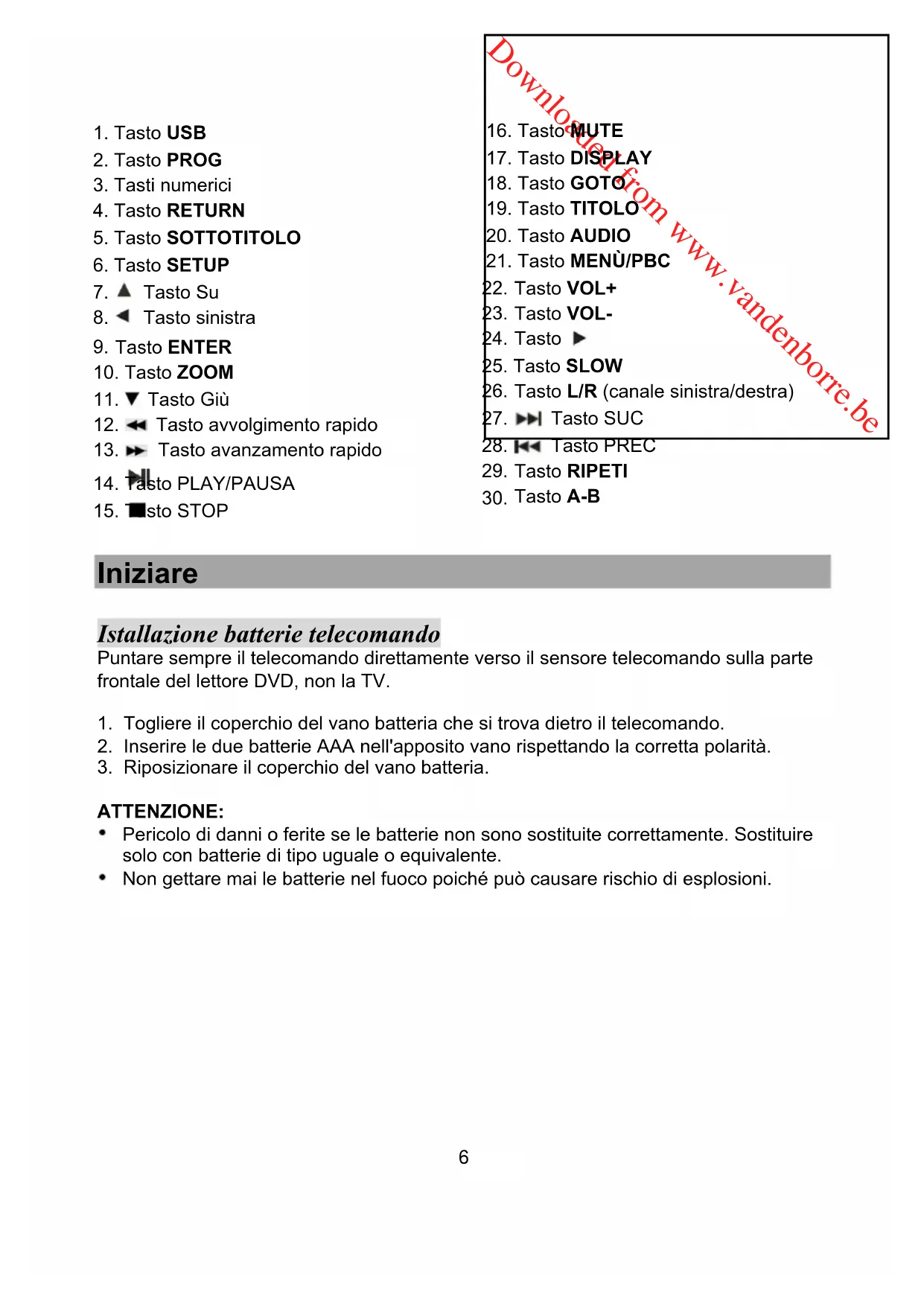 ATTENZIONE: Pericolo di danni o ferite se le batterie non sono sostituite correttamente. Sostituire solo con batterie di tipo uguale o equivalente. Non gettare mai le batterie nel fuoco poiché può causare rischio di esplosioni.Downloaded from www.vandenborre.be