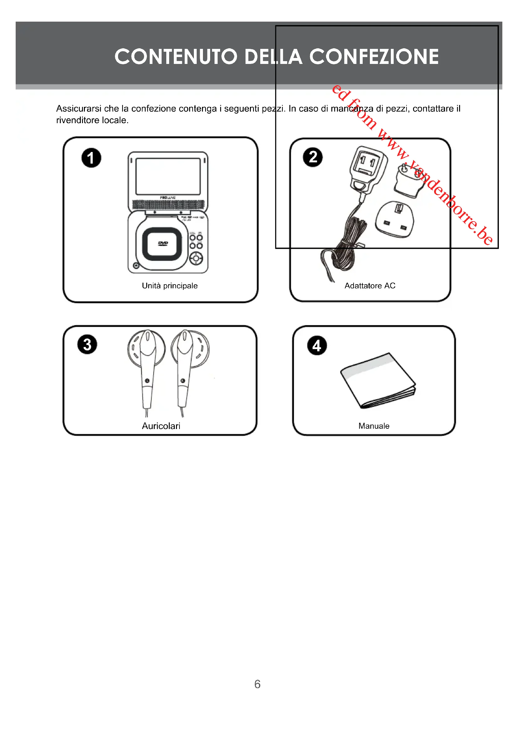 La qualità di produzione del disco DVD può variare; alcuni dischi possono deviare dagli standard dell'industria. Alcuni dischi formattati in modo non corretto possono comunque essere riprodotti, ma la qualità di funzionamento e riproduzione del disco possono essere inferiori allo standard. Alimentazione elettrica Se il lettore non viene usato a lungo, impostare l'interruttore di alimentazione su OFF e staccare il lettore. Salvaschermo Se non si usa il lettore per 5 minuti, il salvaschermo si avvierà automaticamente: premere qualsiasi tasto per fermarlo, altrimenti il lettore entrerà in modo standby 6 minuti dopo e per risvegliarlo occorrerà premere il tasto Invio.Downloaded from www.vandenborre.beDownloaded from www.vandenborre.be