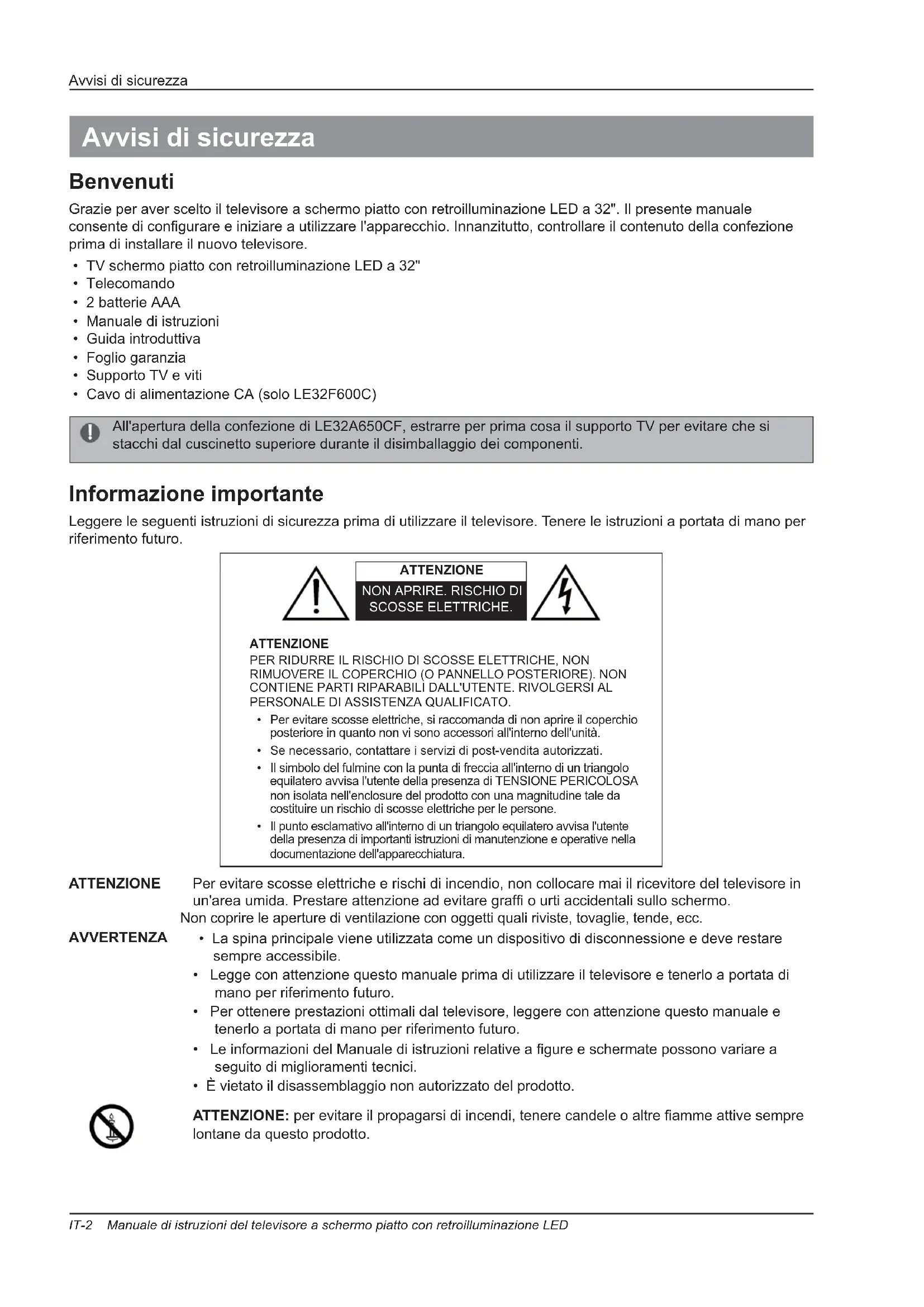 Appendice ...............................................26Avvisi di sicurezza IT-2 Manuale di istruzioni del televisore a schermo piatto con retroilluminazione LED Benvenuti Grazie per aver scelto il televisore a schermo piatto con retroilluminazione LED a 32". Il presente manuale