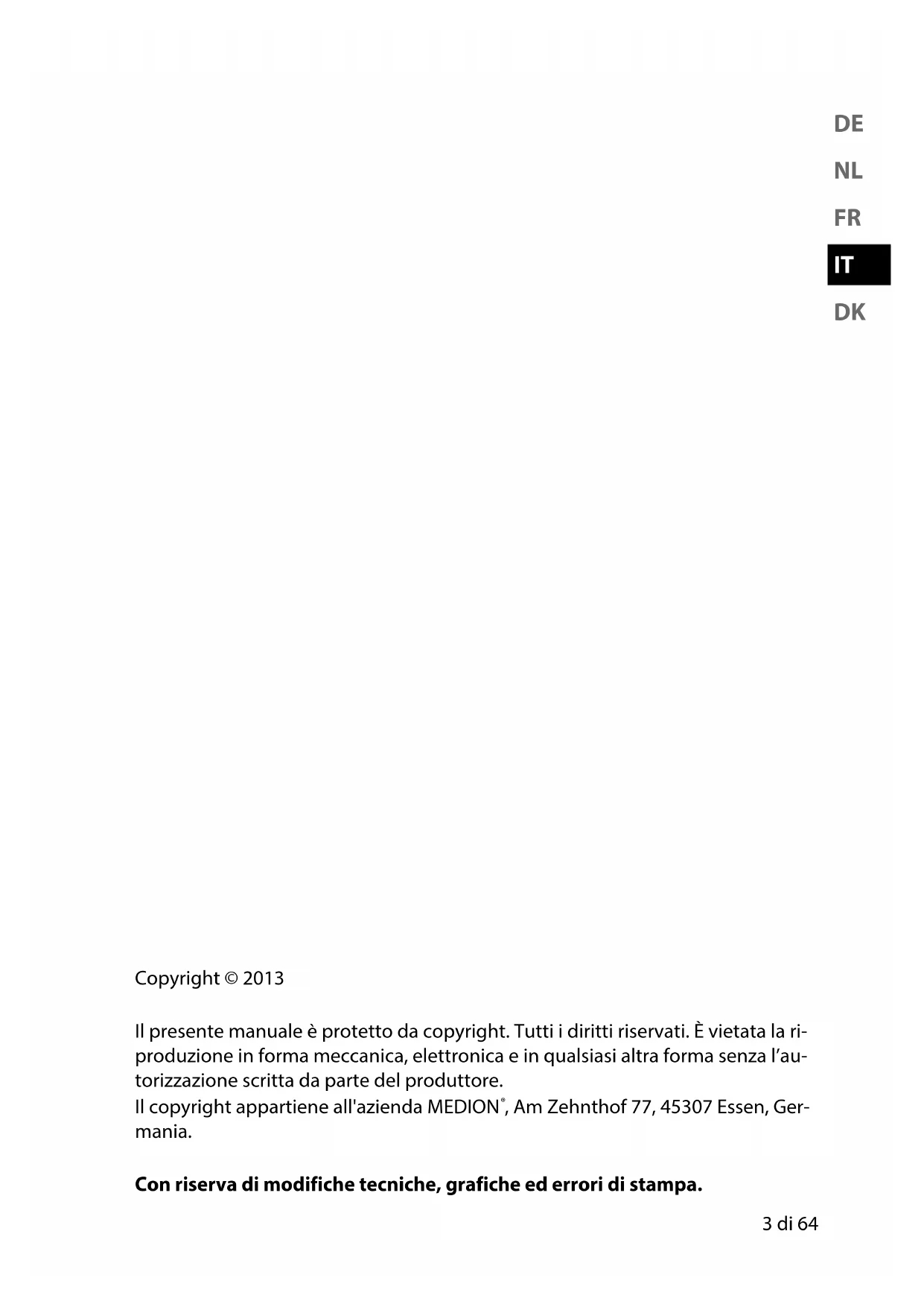 Copyright © 2013 Il presente manuale è protetto da copyright. Tutti i diritti riservati. È vietata la ri- produzione in forma meccanica, elettronica e in qualsiasi altra forma senza l’au- torizzazione scritta da parte del produttore. Il copyright appartiene all'azienda MEDION