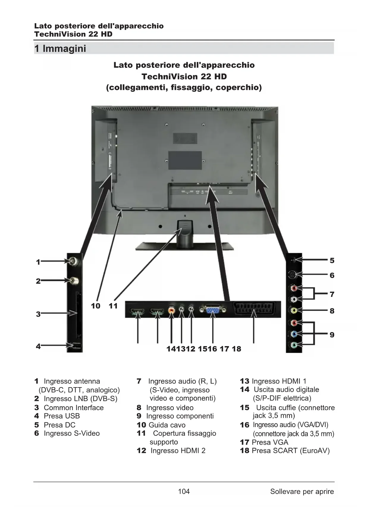 Lato posteriore dell'apparecchio TechniVision 22 HD Sollevare per aprire 1 Ingresso antenna (DVB-C, DTT, analogico) 2 Ingresso LNB (DVB-S) 3 Common Interface 4 Presa USB 5 Presa DC 6 Ingresso S-Video 7 Ingresso audio (R, L) (S-Video, ingresso video e componenti) 8 Ingresso video 9 Ingresso componenti 10 Guida cavo 11 Copertura fissaggio supporto 12 Ingresso HDMI 2 13 Ingresso HDMI 1 14 Uscita audio digitale (S/P-DIF elettrica) 15 Uscita cuffie (connettore jack 3,5 mm)