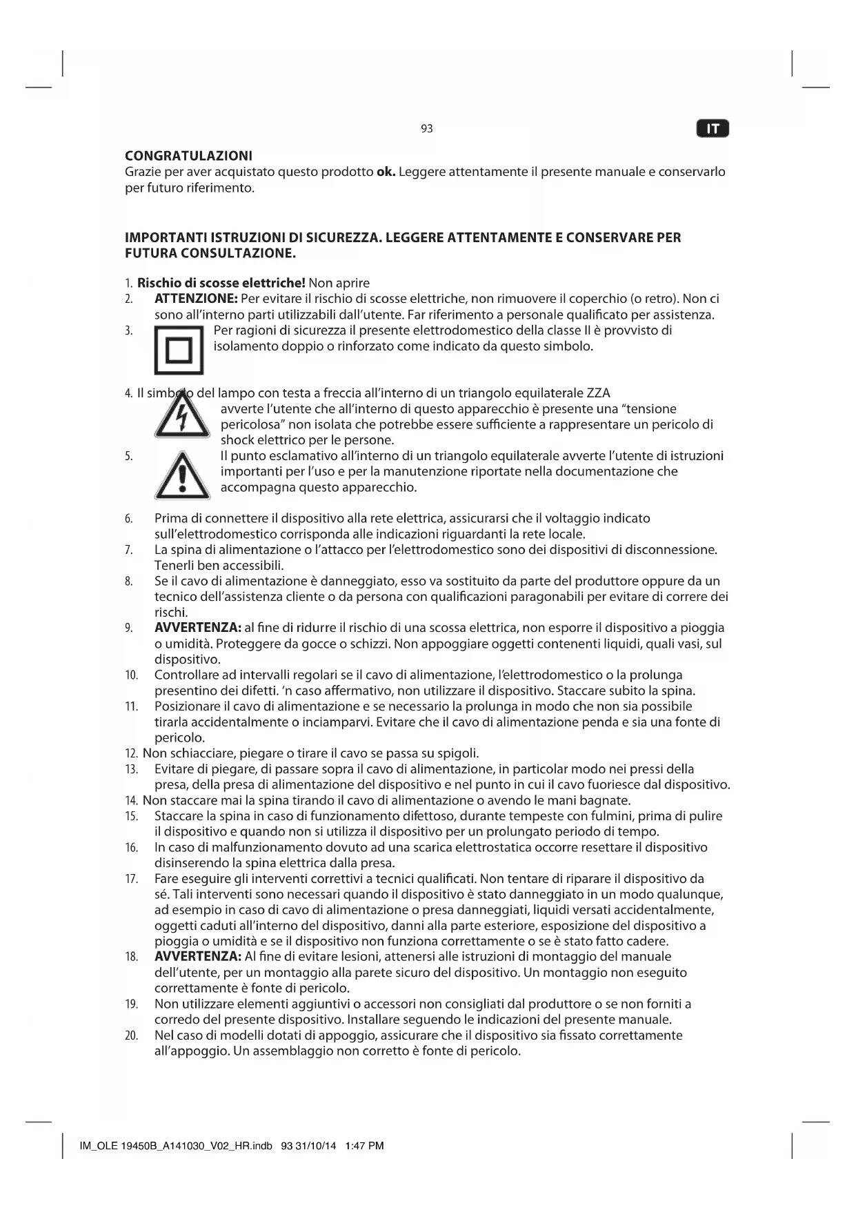 SMALTIMENTO Il simbolo del cassonetto dell’immondizia barrato richiede una raccolta separata di riuti elettrici e di equipaggiamento elettronico (WEEE). l’equipaggiamento elettrico ed elettronico può contenere delle sostanze nocive. non smaltire questi apparecchi con i riuti domestici. consegnarlo presso un punto di raccolta per il riciclo WEEE. così aiutate a risparmiare le risorse ed a proteggere l’ambiente. contattare le autorità o il rivenditore locale per ulteriori informazioni. IM_OLE 19450B_A141030_V02_HR.indb 107 31/10/14 1:47 PMDE