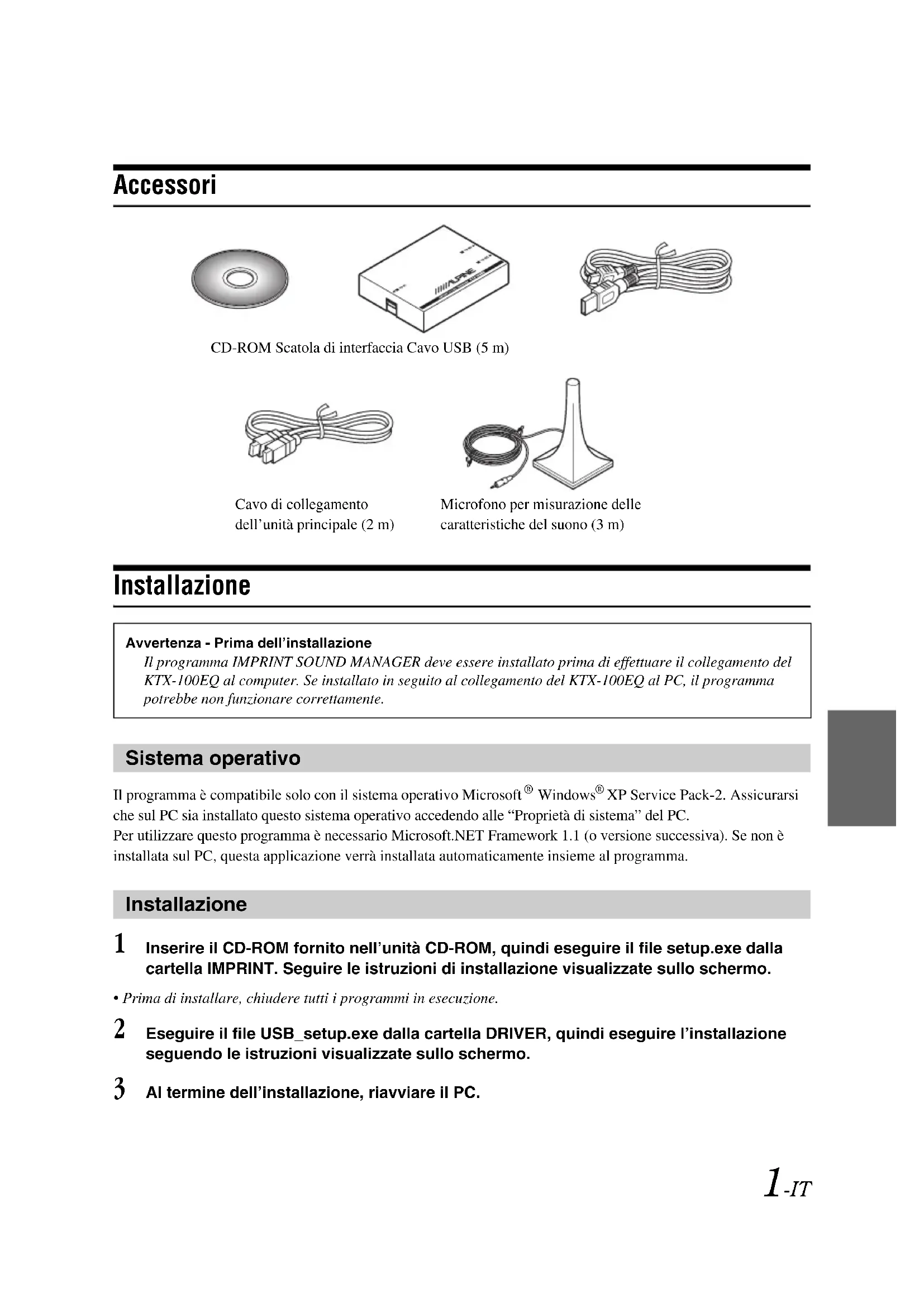 Al termine dell’installazione, riavviare il PC. Avvertenza - Prima dell’installazioneIl programma IMPRINT SOUND MANAGER deve essere installato prima di effettuare il collegamento del KTX-100EQ al computer. Se installato in seguito al collegamento del KTX-100EQ al PC, il programma potrebbe non funzionare correttamente. Sistema operativo Installazione CD-ROM Scatola di interfaccia Cavo USB (5 m)Microfono per misurazione delle caratteristiche del suono (3 m)Cavo di collegamento dell’unità principale (2 m) KTX-100EQ.book Page 1 Friday, April 13, 2007 4:31 PM2-IT ALPINE KTX-100EQ 68-08564Z99-A (IT) Collegamenti Prima di impostare il MultEQ, collegare tutti gli altri dispositivi.