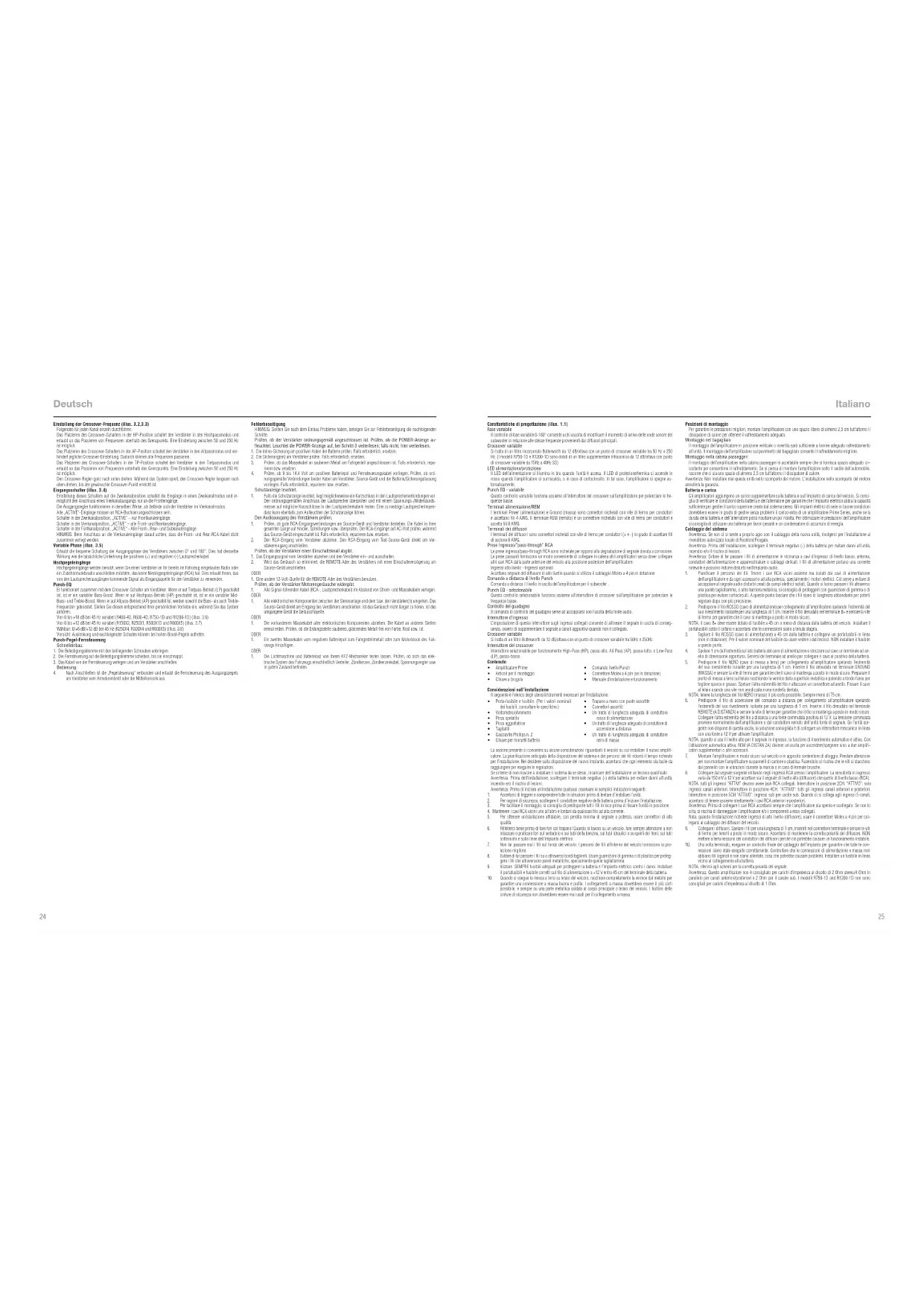 trische System des Fahrzeugs einschließlich Verteiler, Zündkerzen, Zündkerzenkabel, Spannungsregler usw. in gutem Zustand befinden. Deutsch Caratteristiche di progettazione (illus. 1.1) Fase variabile Il controllo di fase variabile 0-180° consente a chi ascolta di modificare il momento di arrivo delle onde sonore del subwoofer in relazione alle stesse frequenze provenienti dai diffusori principali. Crossover variabile Si tratta di un filtro incorporato Butterworth da 12 dB/ottava con un punto di crossover variabile tra 50 Hz e 250 Hz. (I modelli R750-1D e R1200-1D sono dotati di un filtro supplementare infrasonico da 12 dB/ottava con punto di crossover variabile da 15Hz a 40Hz SS) LED alimentazione/protezione Il LED dell’alimentazione si illumina in blu quando l’unità è accesa. Il LED di protezione/termica si accende in rosso quando l’amplificatore si surriscalda, o in caso di cortocircuito. In tal caso, l’amplificatore si spegne au- tomaticamente. Punch EQ - variabile Questo controllo variabile funziona assieme all’interruttore del crossover sull’amplificatore per potenziare le fre- quenze basse. Terminali alimentazione/REM I terminali Power (alimentazione) e Ground (massa) sono connettori nichelati con vite di fermo per conduttori e accettano fili 4 AWG. Il terminale REM (remoto) è un connettore nichelato con vite di fermo per conduttori e accetta fili 8 AWG. Terminali dei diffusori I terminali dei diffusori sono connettori nichelati con vite di fermo per conduttori (+ e -) in grado di accettare fili di sezione 8 AWG. Prese Ingresso/”pass-through” RCA Le prese ingresso/pass-through RCA sono nichelate per opporsi alla degradazione di segnale dovuta a corrosione. Le prese passanti forniscono un modo conveniente di collegare in catena altri amplificatori senza dover collegare altri cavi RCA dalla parte anteriore del veicolo alla posizione posteriore dell’amplificatore. Ingressi alto livello - Ingressi opzionali Accettano segnale del diffusore di alto livello quando si utilizza il cablaggio Molex a 4 pin in dotazione. Comando a distanza di livello Punch Comanda a distanza il livello in uscita dell’amplificatore per il subwoofer . Punch EQ - selezionabile Questo controllo selezionabile funziona assieme all’interruttore di crossover sull’amplificatore per potenziare le frequenze basse. Controllo del guadagno Il comando di controllo del guadagno serve ad accoppiarsi con l’uscita della fonte audio. Interruttore d’ingresso L’impostazione di questo interruttore sugli ingressi collegati consente di allineare il segnale in uscita di conseg- uenza, ovvero di supplementare il segnale a canali aggiuntivi quando non è collegato. Crossover variabile Si tratta di un filtro Butterworth da 12 dB/ottava con un punto di crossover variabile tra 50Hz e 250Hz. Interruttore del crossover Interruttore selezionabile per funzionamento High-Pass (HP), passa-alto, All Pass (AP), passa-tutto, o Low-Pass (LP), passa-basso. Contenuto Considerazioni sull’installazione Il seguente è l’elenco degli utensili/strumenti necessari per l’installazione: La sezione presente si concentra su alcune considerazioni riguardanti il veicolo su cui installare il nuovo amplifi- catore. La pianificazione anticipata della disposizione del sistema e dei percorsi dei fili ridurrà il tempo richiesto per l’installazione. Nel decidere sulla disposizione del nuovo impianto, accertarsi che ogni elemento sia facile da raggiungere per eseguire le regolazioni. Se si teme di non riuscire a installare il sistema da se stessi, incaricare dell’installazione un tecnico qualificato Avvertenza: Prima dell’installazione, scollegare il terminale negativo (-) della batteria per evitare danni all’unità, incendio e/o il rischio di lesioni. Avvertenza: Prima di iniziare un’installazione qualsiasi osservare le semplici indicazioni seguenti: