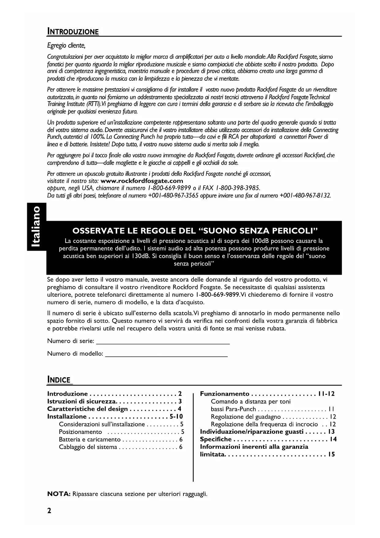 Benvenuti alla Rockford Fosgate! Questo manuale è stato concepito per fornire ragguagli al proprietario, al rivenditore e all'installatore. Per coloro che desiderano informazioni rapide circa l'installazione di questo prodotto, vi preghiamo di consulfare la sezione Installazione di questo manuale. Altri ragguagli sono disponibiliattraverso l'Indice. Alla Rockford Fosgate,obbiamo fatto di tutto per assicurarci che tutte le informazioni contenate in questo manuale fosso rorno corrente. Pertanto, dato che siamo sempre alla ricerca di nuovi modi per migliorare i nostri prodotti, tali informazioni sono soggette a modificheenza preavviso.