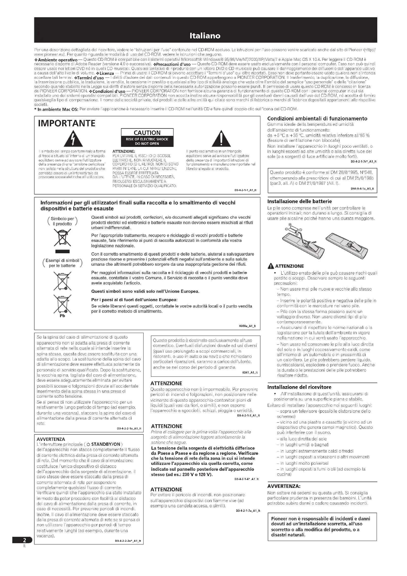 Informazioni per gli utilizzatori finali sulla raccolta e lo smaltimento di vecchi dispositivi e batterie esauste Questi simboli sui prodotti, confezioni, e/o documenti allegati significano che vecchi prodotti elettrici ed elettronici e batterie esauste non devono essere mischiati ai rifiuti urbani indifferenziati. Per l’appropriato trattamento, recupero e riciclaggio di vecchi prodotti e batterie esauste, fate riferimento ai punti di raccolta autorizzati in conformità alla vostra legislazione nazionale. Con il corretto smaltimento di questi prodotti e delle batterie, aiuterai a salvaguardare preziose risorse e prevenire i potenziali effetti negativi sull’ambiente e sulla salute umana che altrimenti potrebbero sorgere da una inappropriata gestione dei rifiuti. Per maggiori informazioni sulla raccolta e il riciclaggio di vecchi prodotti e batterie esauste, contattate il vostro Comune, il Servizio di raccolta o il punto vendita dove avete acquistato l’articolo. Questi simboli sono validi solo nell’Unione Europea. Per i paesi al di fuori dell’unione Europea: Se volete liberarvi questi oggetti, contattate le vostre autorità locali o il punto vendita per il corretto metodo di smaltimento. Esempi di simboli per le batterie Simbolo per il prodotto Se la spina del cavo di alimentazione di questo apparecchio non si adatta alla presa di corrente alternata di rete nella quale si intende inserire la spina stessa, questa deve essere sostituita con una adatta allo scopo. La sostituzione della spina del cavo di alimentazione deve essere effettuata solamente da personale di servizio qualificato. Dopo la sostituzione, la vecchia spina, tagliata dal cavo di alimentazione, deve essere adeguatamente eliminata per evitare possibili scosse o folgorazioni dovute all’accidentale inserimento della spina stessa in una presa di corrente sotto tensione. Se si pensa di non utilizzare l’apparecchio per un relativamente lungo periodo di tempo (ad esempio, durante una vacanza), staccare la spina del cavo di alimentazione dalla presa di corrente alternata di rete. D3-4-2-2-1a_A1_It AVVERTENZAL’interruttore principale ( STANDBY/ON ) dell’apparecchio non stacca completamente il flusso di corrente elettrica dalla presa di corrente alternata di rete. Dal momento che il cavo di alimentazione costituisce l’unico dispositivo di distacco dell’apparecchio dalla sorgente di alimentazione, il cavo stesso deve essere staccato dalla presa di corrente alternata di rete per sospendere completamente qualsiasi flusso di corrente. Verificare quindi che l’apparecchio sia stato installato in modo da poter procedere con facilità al distacco del cavo di alimentazione dalla presa di corrente, in caso di necessità. Per prevenire pericoli di incendi, inoltre, il cavo di alimentazione deve essere staccato dalla presa di corrente alternata di rete se si pensa di non utilizzare l’apparecchio per periodi di tempo relativamente lunghi (ad esempio, durante una vacanza).D3-4-2-2-2a*_A1_ItQuesto prodotto è destinato esclusivamente all'uso domestico. Eventuali disfunzioni dovute ad usi diversi (quali uso prolungato a scopi commerciali, in ristoranti, o uso in auto o su navi) e che richiedano particolari riparazioni, saranno a carico dell'utente, anche se nel corso del periodo di garanzia. K041_A1_It ATTENZIONE Questo apparecchio non è impermeabile. Per prevenire pericoli di incendi o folgorazioni, non posizionare nelle vicinanze di questo apparecchio contenitori pieni di liquidi (quali vasi da fiori, o simili), e non esporre l’apparecchio a sgocciolii, schizzi, pioggia o umidità.D3-4-2-1-3_A1_It ATTENZIONE Prima di collegare per la prima volta l’apparecchio alla sorgente di alimentazione leggere attentamente la sezione che segue.La tensione della sorgente di elettricità differisce da Paese a Paese e da regione a regione. Verificare che la tensione di rete della zona in cui si intende utilizzare l’apparecchio sia quella corretta, come indicato sul pannello posteriore dell’apparecchio stesso (ad es.: 230 V o 120 V).D3-4-2-1-4*_A1_It ATTENZIONE Per evitare il pericolo di incendi, non posizionare sull’apparecchio dispositivi con fiamme vive (ad esempio una candela accesa, o simili).D3-4-2-1-7a_A1_It Condizioni ambientali di funzionamento Gamma ideale della temperatura ed umidità dell’ambiente di funzionamento:da +5 °C a +35 °C, umidità relativa inferiore all‘85 % (fessure di ventilazione non bloccate)Non installare l’apparecchio in luoghi poco ventilati, o in luoghi esposti ad alte umidità o alla diretta luce del sole (o a sorgenti di luce artificiale molto forti).D3-4-2-1-7c*_A1_It Questo prodotto è conforme al DM 28/8/1995, Nº548, ottemperando alle prescrizioni di cui al DM 25/6/1985 (par.3, all. A) e DM 27/8/1987 (All. I). D44-9-4-1a_A1_It Pioneer non è responsabile di incidenti e danni dovuti ad un’installazione scorretta, all’uso scorretto o alla modica del prodotto, o a disastri naturali.English Français Italiano Español Nederlands Deutsch