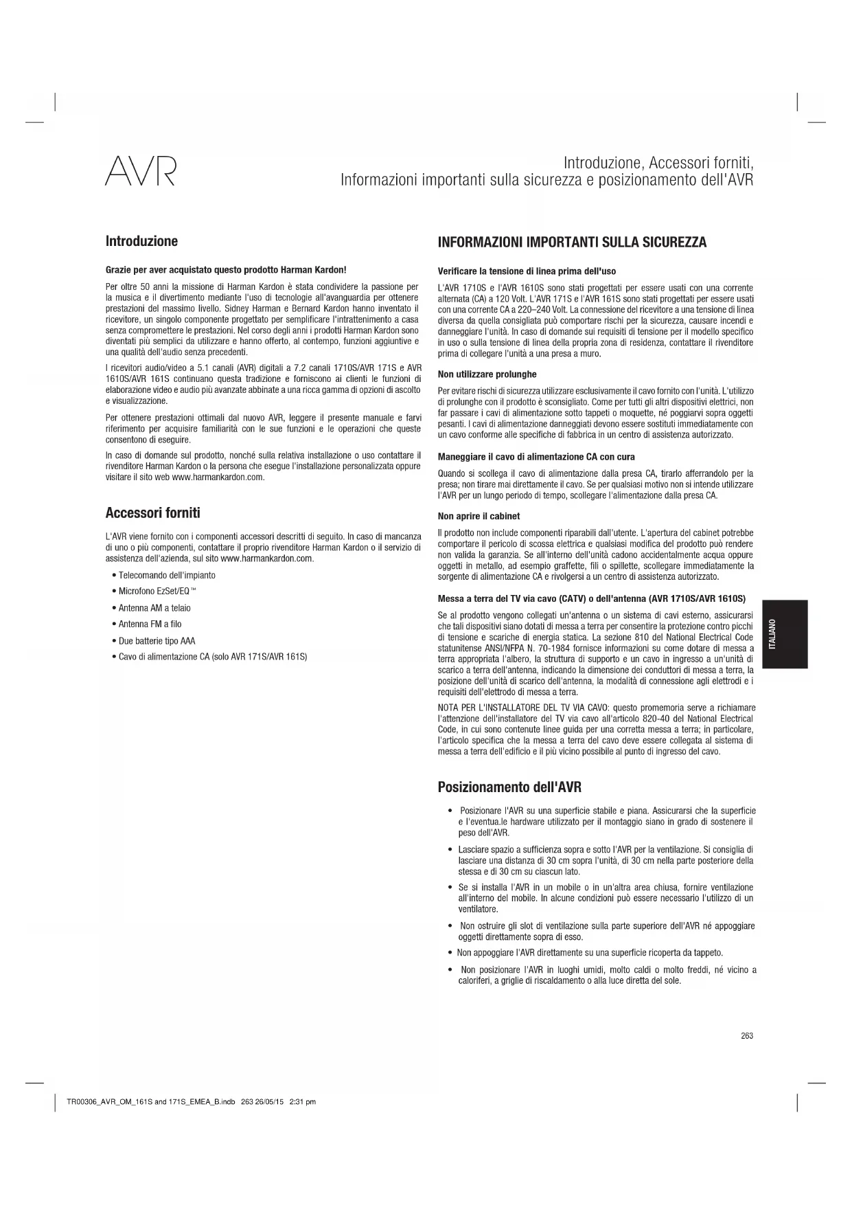 SPECIFICHE 36 APPENDICE 37 TR00306_AVR_OM_161S and 171S_EMEA_B.indb 262 26/05/15 2:31 pm263 ITALIANO AVR Introduzione, Accessori forniti, Informazioni importanti sulla sicurezza e posizionamento dell'AVR Introduzione Grazie per aver acquistato questo prodotto Harman Kardon! Per oltre 50 anni la missione di Harman Kardon è stata condividere la passione per la musica e il divertimento mediante l'uso di tecnologie all'avanguardia per ottenere prestazioni del massimo livello. Sidney Harman e Bernard Kardon hanno inventato il ricevitore, un singolo componente progettato per semplificare l'intrattenimento a casa senza compromettere le prestazioni. Nel corso degli anni i prodotti Harman Kardon sono diventati più semplici da utilizzare e hanno offerto, al contempo, funzioni aggiuntive e una qualità dell'audio senza precedenti. I ricevitori audio/video a 5.1 canali (AVR) digitali a 7.2 canali 1710S/AVR 171S e AVR 1610S/AVR 161S continuano questa tradizione e forniscono ai clienti le funzioni di elaborazione video e audio più avanzate abbinate a una ricca gamma di opzioni di ascolto e visualizzazione. Per ottenere prestazioni ottimali dal nuovo AVR, leggere il presente manuale e farvi riferimento per acquisire familiarità con le sue funzioni e le operazioni che queste consentono di eseguire. In caso di domande sul prodotto, nonché sulla relativa installazione o uso contattare il rivenditore Harman Kardon o la persona che esegue l'installazione personalizzata oppure visitare il sito web www.harmankardon.com. Accessori forniti L'AVR viene fornito con i componenti accessori descritti di seguito. In caso di mancanza di uno o più componenti, contattare il proprio rivenditore Harman Kardon o il servizio di assistenza dell'azienda, sul sito www.harmankardon.com.