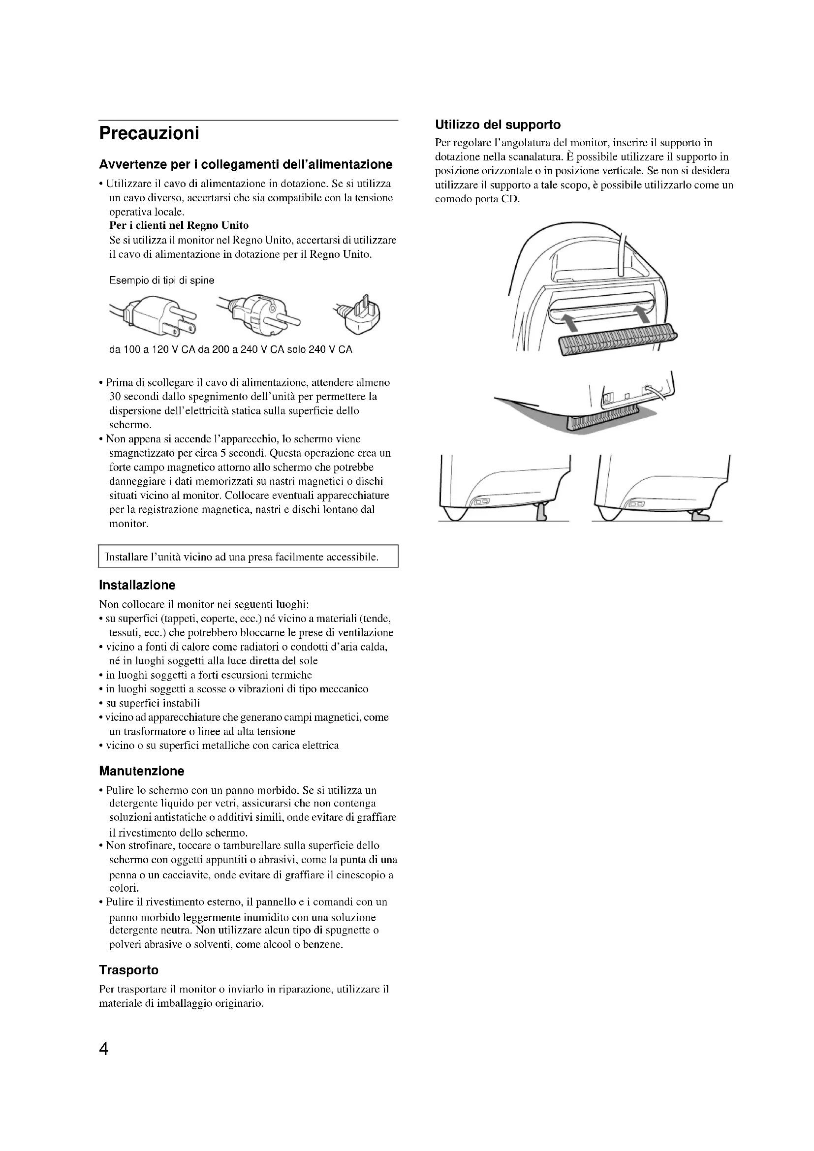 - Pulire il rivestimento esterno, il pannello e i comandi con un panno morbido leggermente inumidito con una soluzione detergente neutra. Non utilizzare alcun tipo di spugnette o polveri abrasive o solventi, come alcool o benzene. Trasporto Per trasportare il monitor o inviarlo in riparazione, utilizzare il materiale di imballaggio originario. Utilizzo del supporto Per regolare l’angolatura del monitor, inserire il supporto in dotazione nella scanalatura. È possibile utilizzare il supporto in posizione orizzontale o in posizione verticale. Se non si desidera utilizzare il supporto a tale scopo, è possibile utilizzarlo come un comodo porta CD. Installare l’unità vicino ad una presa facilmente accessibile. Esempio di tipi di spine da 100 a 120 V CA da 200 a 240 V CA solo 240 V CA 05IT01COV-AEP.book Page 4 Friday, November 24, 2000 4:13 PM5 D:\##SAGYOU\11gatu\1124\4079363111HMD-A420AEP\IT\05IT02BAS-AEP.fm masterpage:Right HMD-A420 4-079-363-