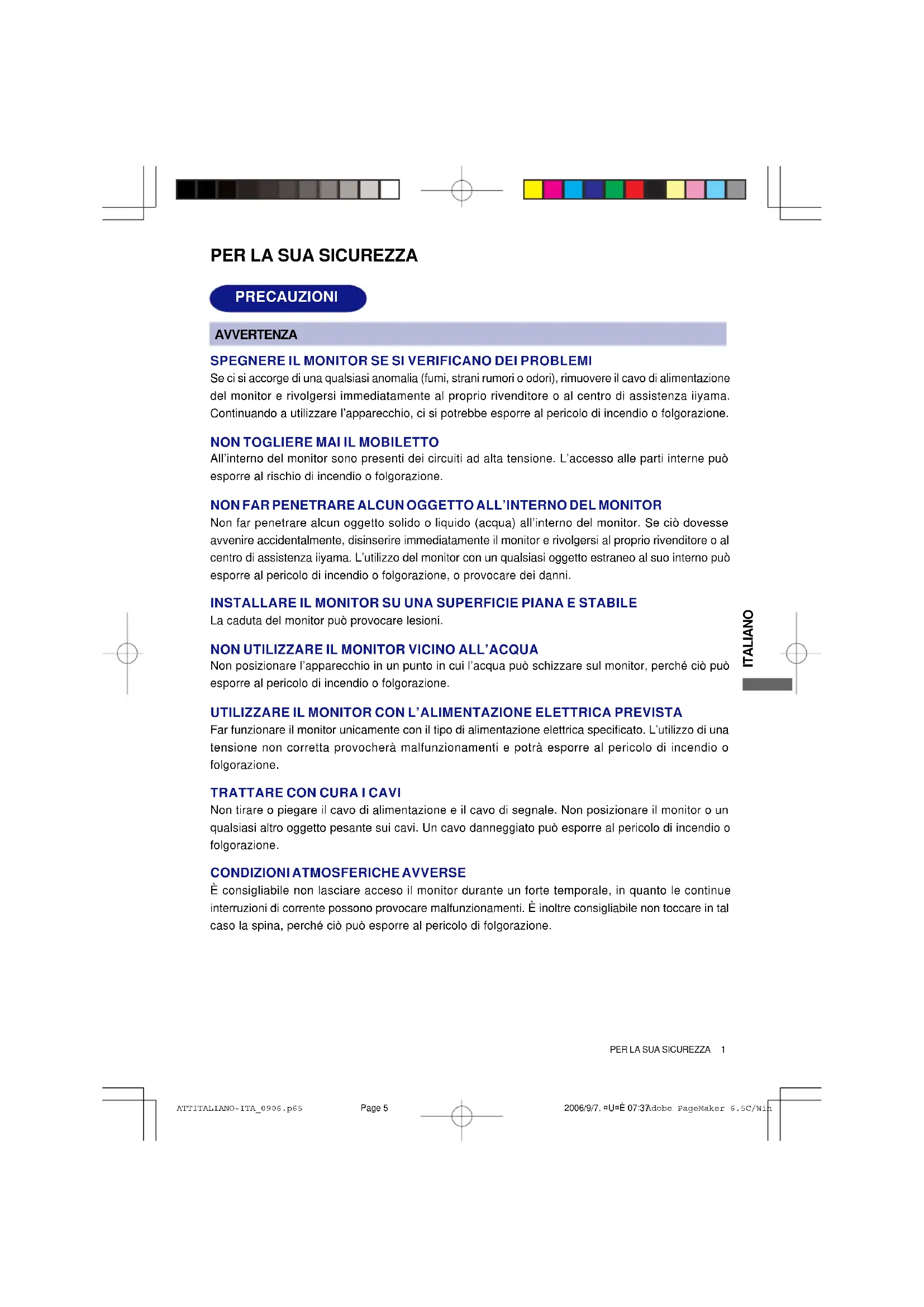 È consigliabile non lasciare acceso il monitor durante un forte temporale, in quanto le continue interruzioni di corrente possono provocare malfunzionamenti. È inoltre consigliabile non toccare in tal caso la spina, perché ciò può esporre al pericolo di folgorazione. PRECAUZIONI ATTITALIANO-ITA_0906.p65 2006/9/7, ¤U¤È 07:37Page 5 Adobe PageMaker 6.5C/WinITALIANO ATTENZIONE
