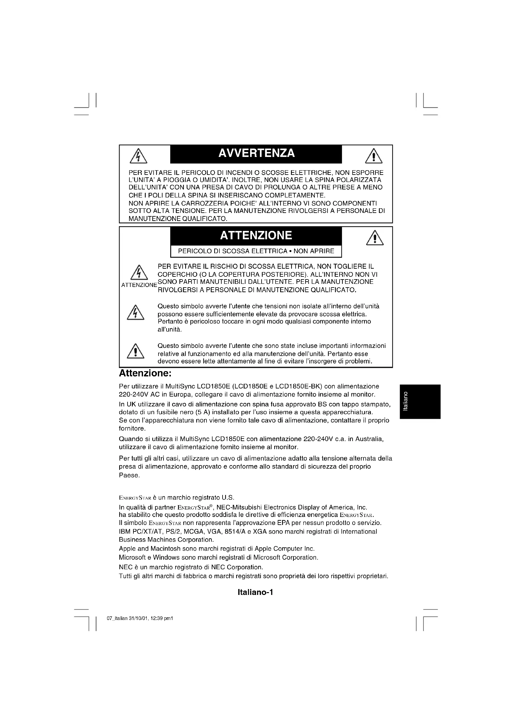 Attenzione: Per utilizzare il MultiSync LCD1850E (LCD1850E e LCD1850E-BK) con alimentazione 220-240V AC in Europa, collegare il cavo di alimentazione fornito insieme al monitor. In UK utilizzare il cavo di alimentazione con spina fusa approvato BS con tappo stampato, dotato di un fusibile nero (5 A) installato per l’uso insieme a questa apparecchiatura. Se con l’apparecchiatura non viene fornito tale cavo di alimentazione, contattare il proprio fornitore. Quando si utilizza il MultiSync LCD1850E con alimentazione 220-240V c.a. in Australia, utilizzare il cavo di alimentazione fornito insieme al monitor. Per tutti gli altri casi, utilizzare un cavo di alimentazione adatto alla tensione alternata della presa di alimentazione, approvato e conforme allo standard di sicurezza del proprio Paese. ENERGYSTA R è un marchio registrato U.S. In qualità di partner ENERGYSTA R